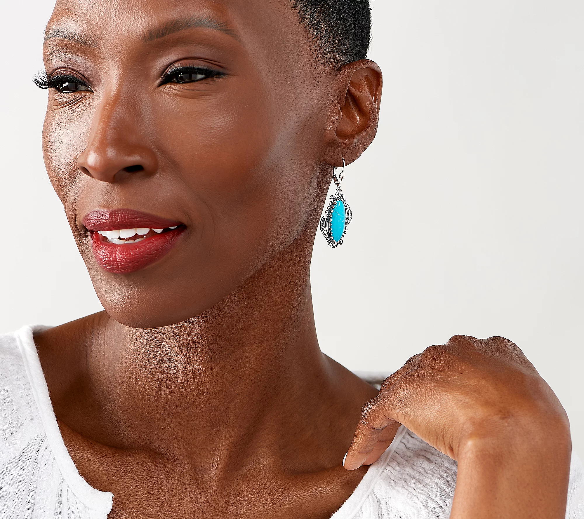 Embracing a free-spirited energy, these oval blue turquoise earrings sway sweetly with a leaf and scroll motif that brings any outfit to next-level status. From American West Jewelry.