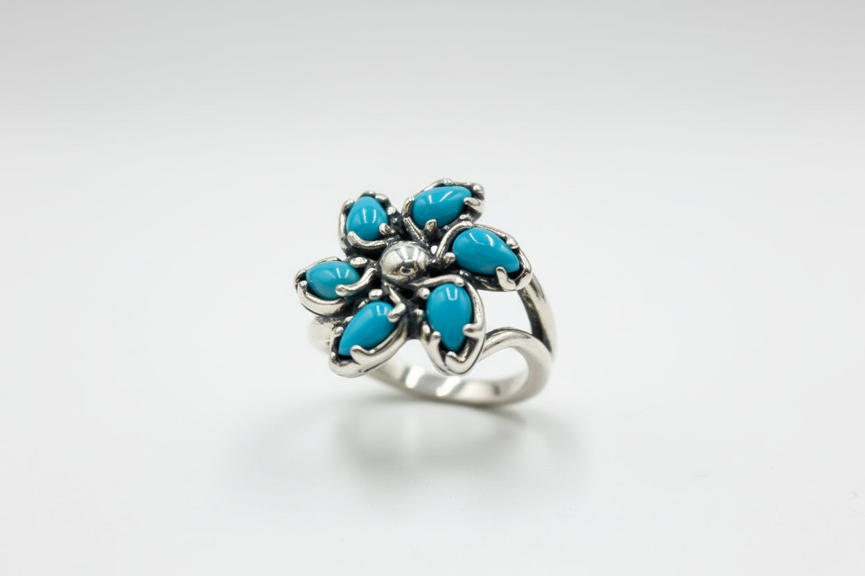 Six Sleeping Beauty turquoise cabochons reach outward in a pinwheel-shaped design to create this sweet sterling silver ring. From Carolyn Pollack Sterling Jewelry.