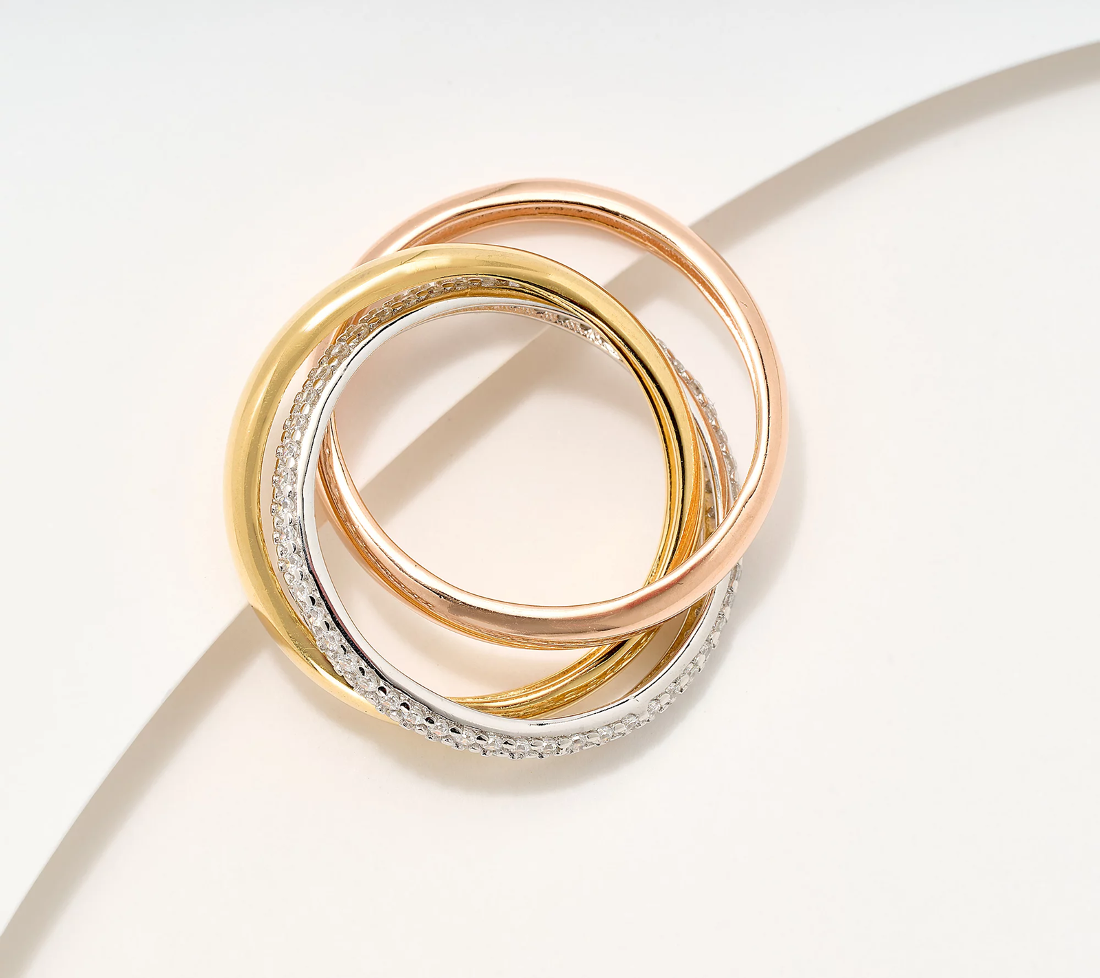 Mix up your look with a ring that's all about movement and shine. With a playful nod to Italian style, the tricolor bands effortlessly interlock in an eye-catching design. Diamonique simulated diamonds elevate the rhodium-plated band, their sparkle playing off the polished bands, creating a look that's classic and modern at once.