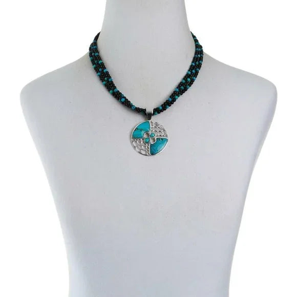 The bold oval turquoise pendant is meticulously hand-cut and set in polished sterling silver, highlighting the gemstone’s natural brilliance and character. Suspended from a 20-inch strand of matching turquoise beads, this necklace captures the essence of organic elegance and global craftsmanship.