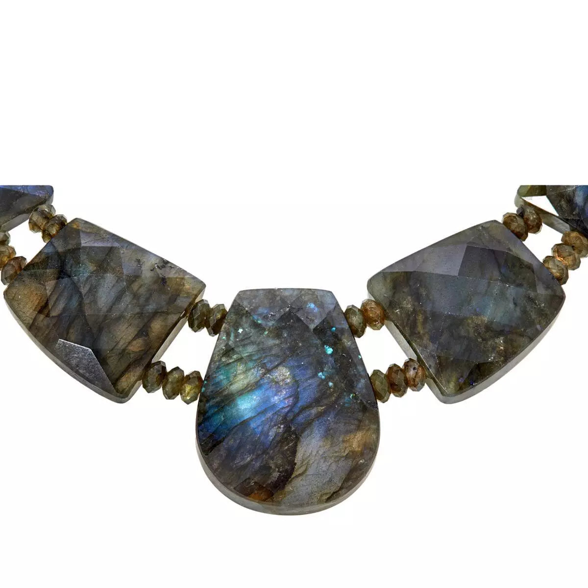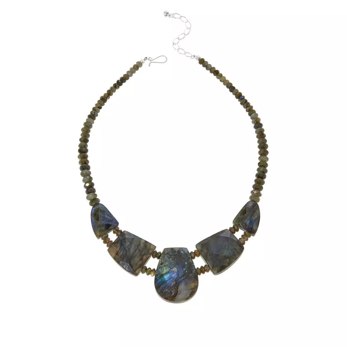 The Jay King Sterling Silver Gray Labradorite Bib-Style Necklace (18") is an elegant statement piece that showcases the mystical beauty of labradorite in a bold, sophisticated design.