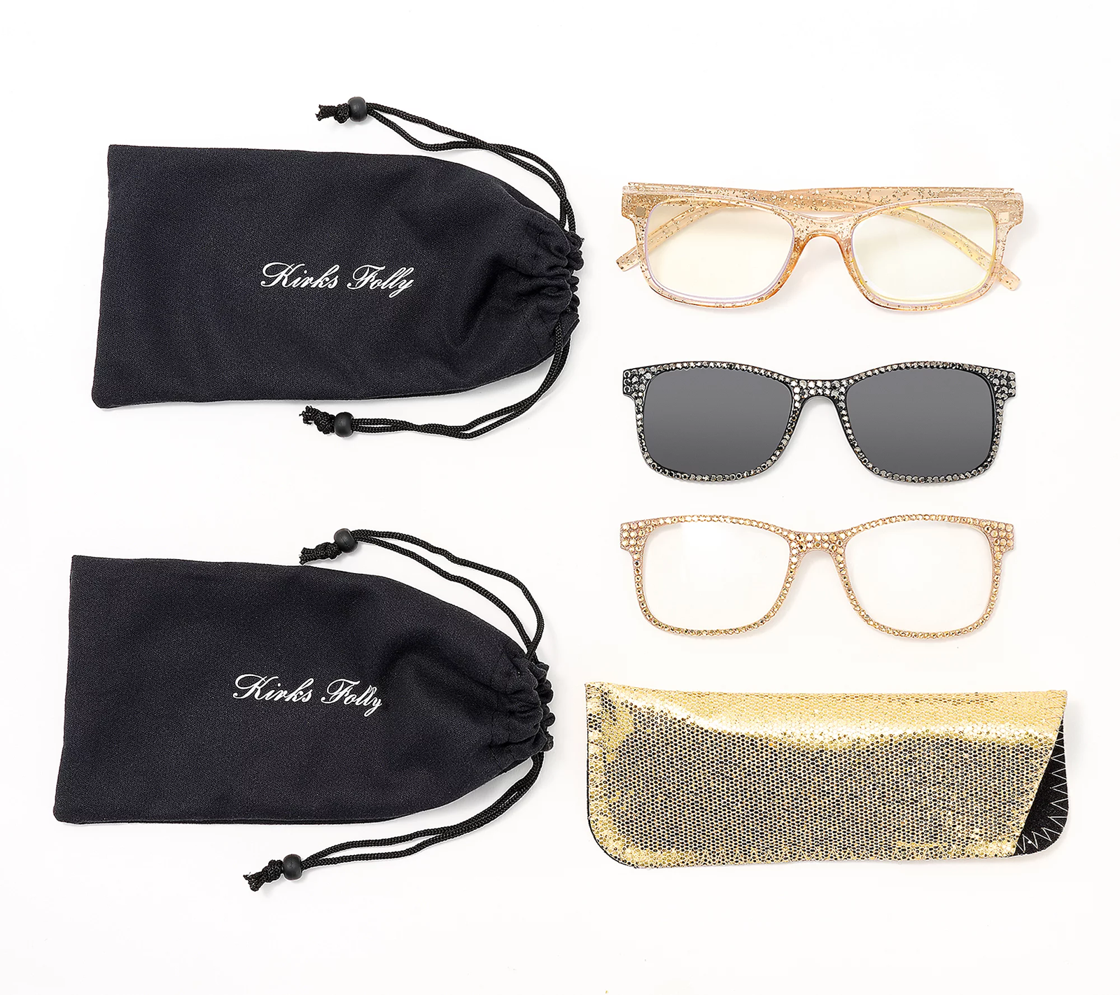 Attention all goddesses! Read that fine print while adding face-framing glam with this set of readers from Kirks Folly. Sharpen your focus with gorgeous glitter readers, or switch up your look in seconds by attaching the magnetic crystal-covered clear lens. Heading outdoors for some light reading perhaps? Snap on the magnetic sunglass cover with aurora borealis crystals and show off your sparkling personality while shading those peepers. From Kirks Folly.