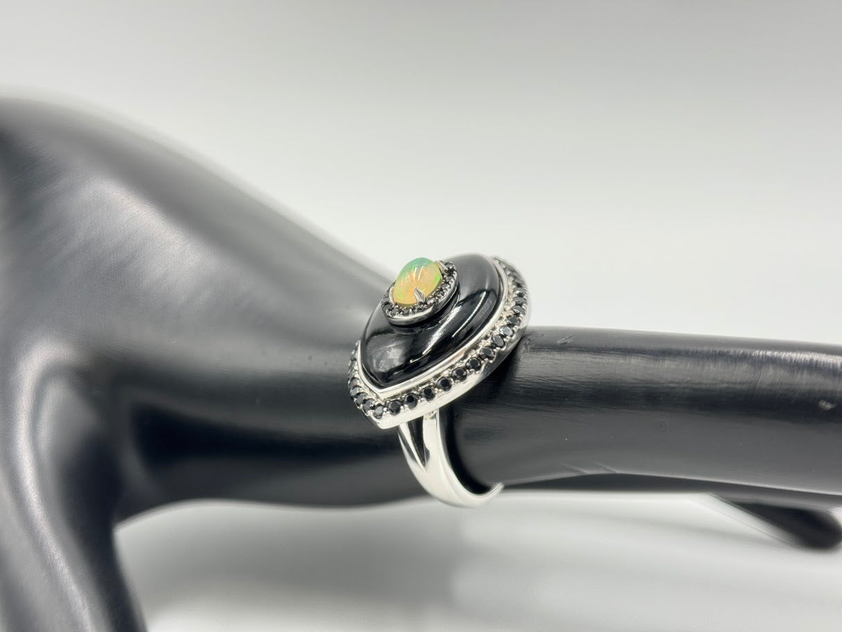 Add symbolic style and striking elegance to your jewelry collection with this Rarities sterling silver Evil Eye ring. Featuring a bold onyx center, luminous opal, and sparkling spinel accents, this meaningful design is believed to offer protection while delivering eye-catching beauty.