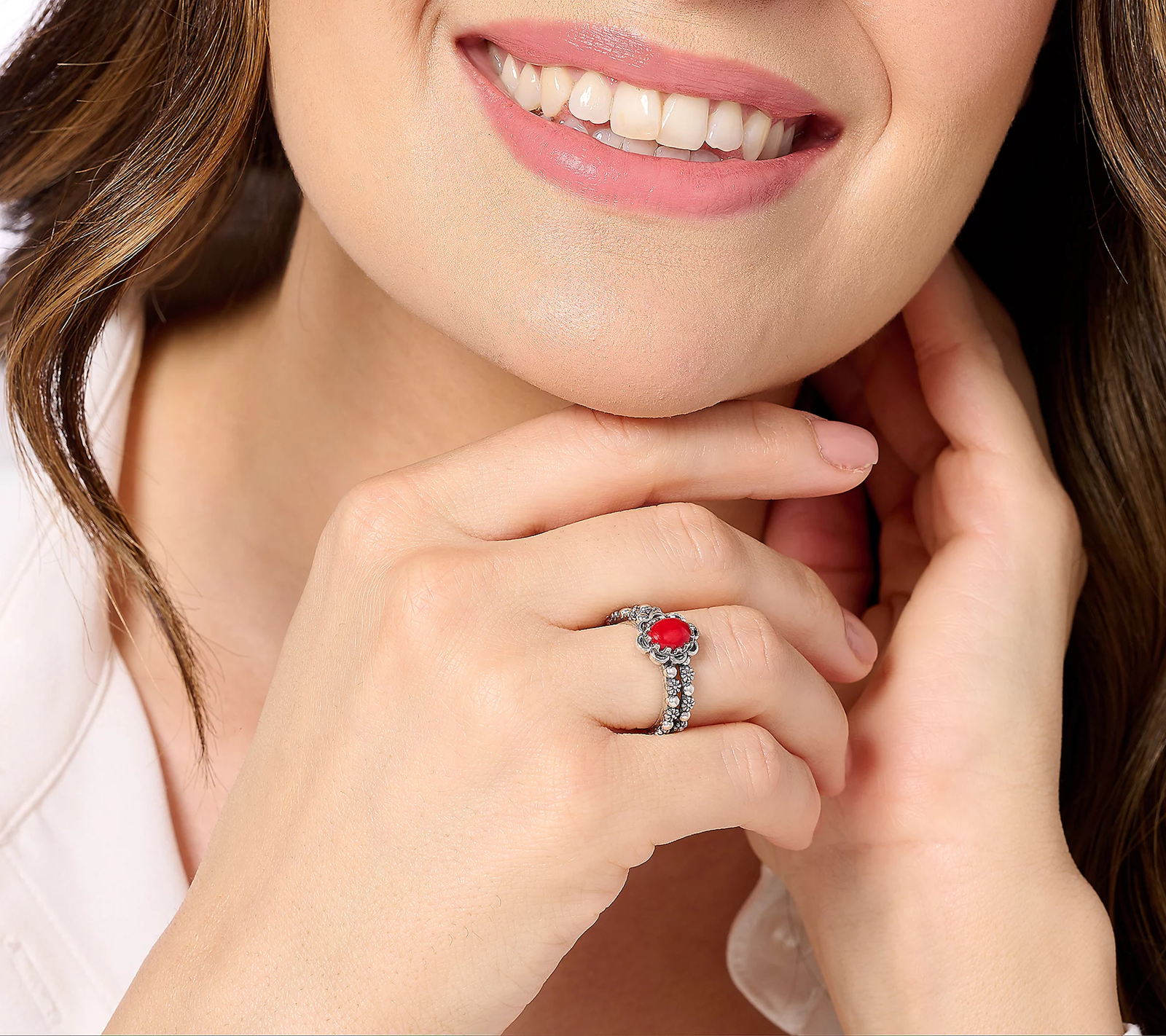 A double band of concha flowers elevates this oval gemstone cabochon ring to full bloom status. From American West Jewelry.