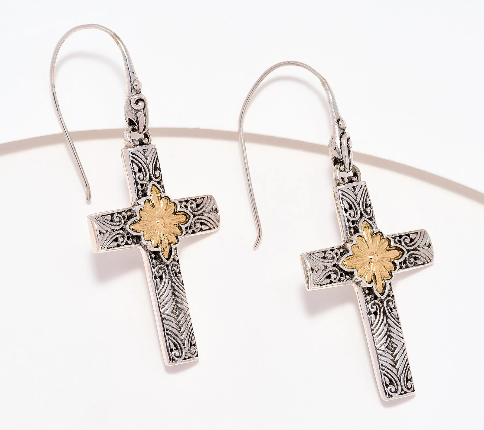 Distinct scrollwork details surround a sunburst of 18K gold on these fancy cross earrings. Let them embrace your beliefs in beautiful artisan style.