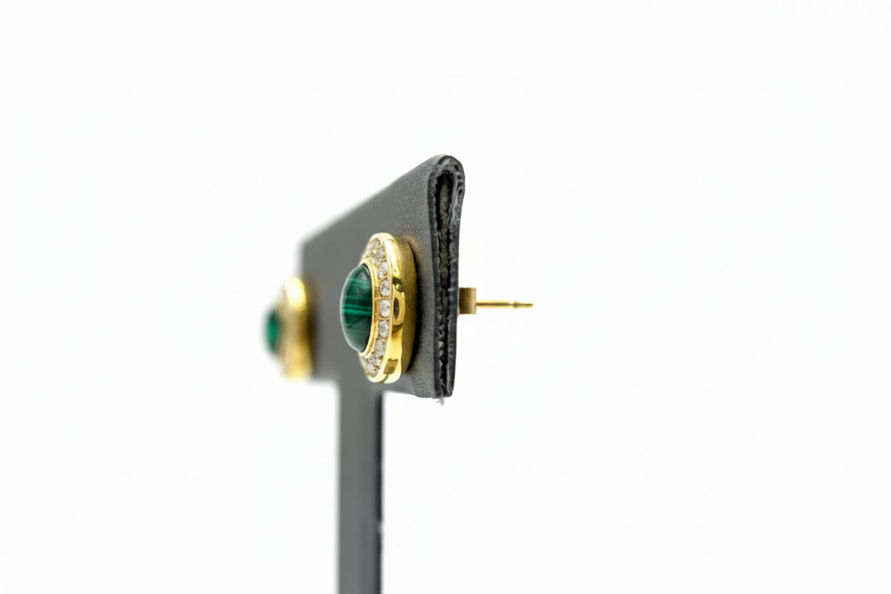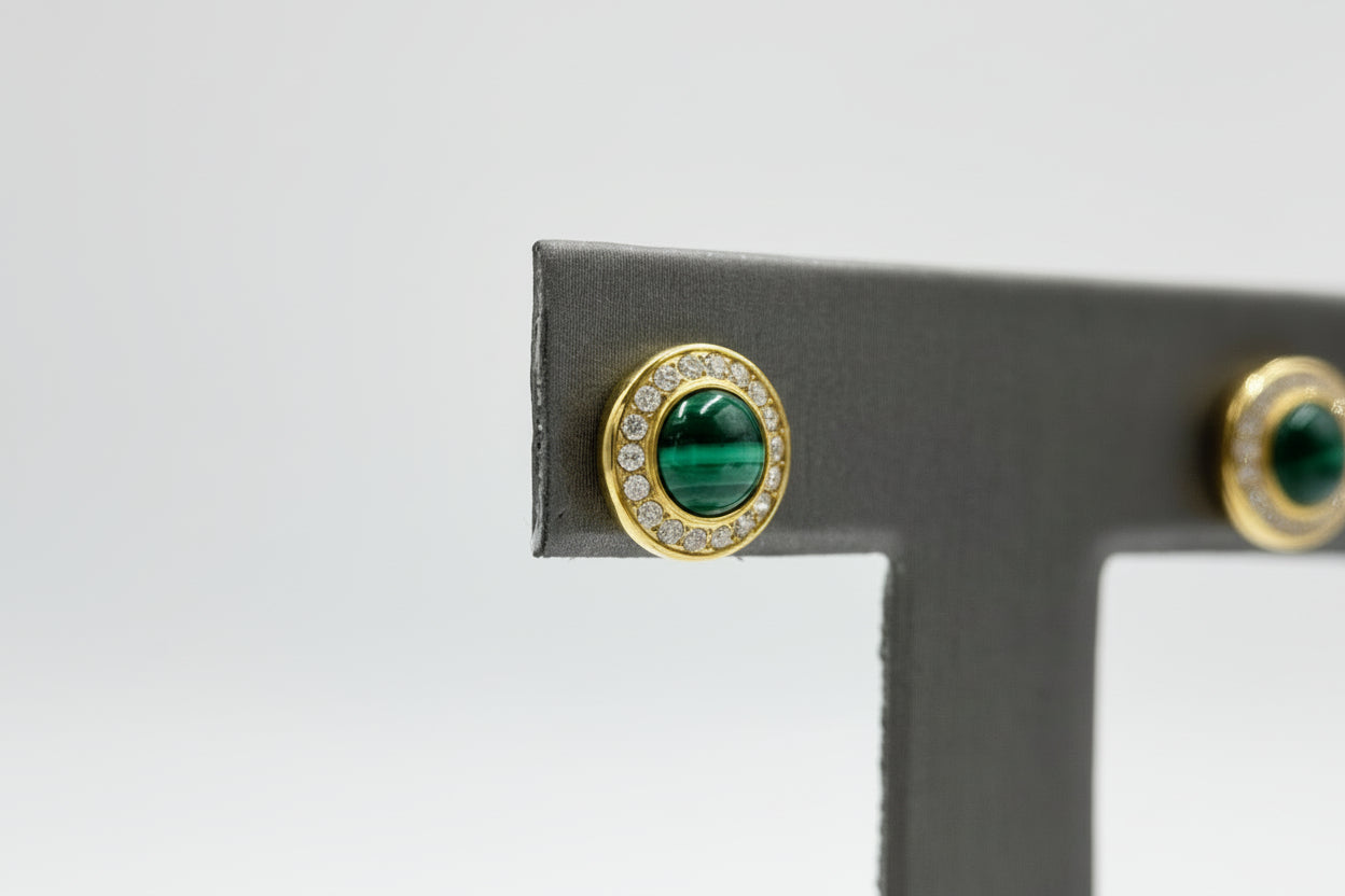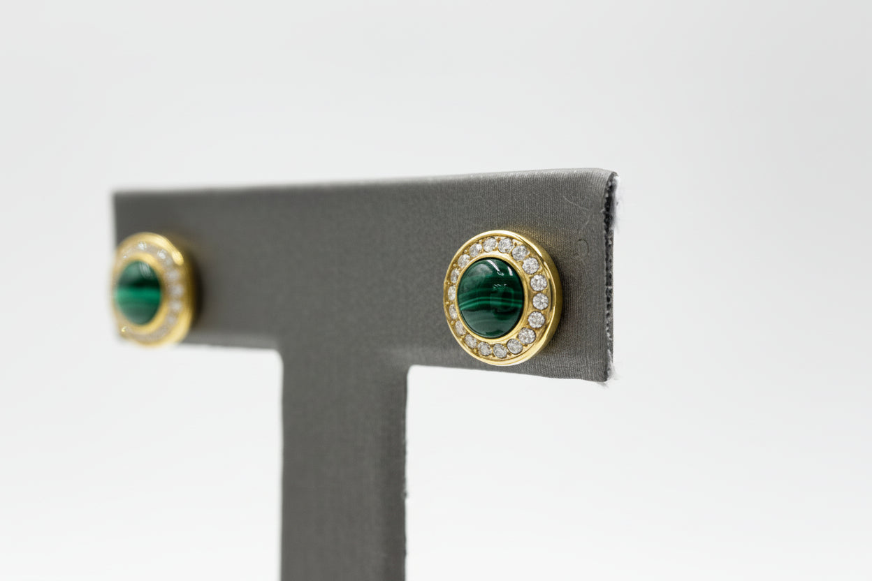 Mejora tu colección de joyas con los aretes de botón de malaquita y topacio blanco en tono dorado de Colleen Lopez : una impresionante combinación de colores vibrantes y sofisticación clásica . Estos exquisitos aretes lucen gemas de malaquita verde intenso , conocidas por su singular banda natural , bellamente realzadas por brillantes detalles de topacio blanco . El engaste dorado les da un toque cálido y lujoso, convirtiéndolos en una adición versátil a cualquier armario.