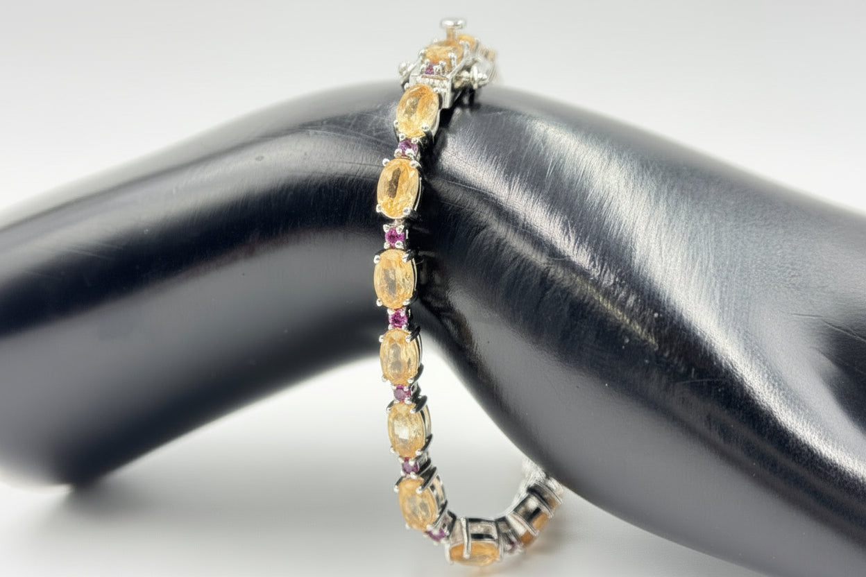 Realza tu estilo diario con la pulsera de tenis Colleen Lopez Madeira de citrino y circonita blanca . Elaborada en plata de ley , esta pieza clásica y radiante presenta un diseño alternado de gemas de citrino de Madeira en un intenso tono dorado anaranjado y brillantes detalles de circonita blanca , que le otorgan un brillo lujoso, perfecto para cualquier ocasión . Ya sea para un evento especial o para añadir un toque de glamour a tu look diario , esta pulsera es imprescindible para los amantes de las piedras preciosas .