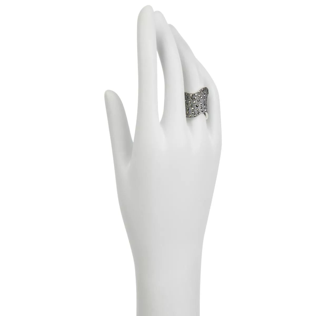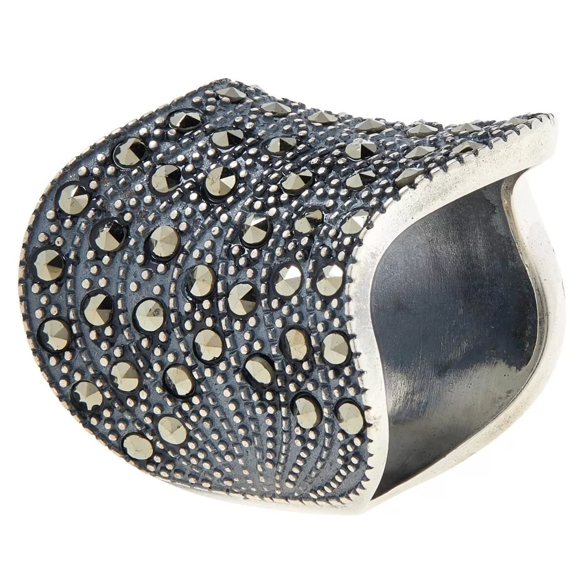 Este elegante anillo de inspiración vintage presenta un elegante diseño de ondas adornado con brillantes piedras de marcasita , que crean un impresionante brillo de estilo antiguo .