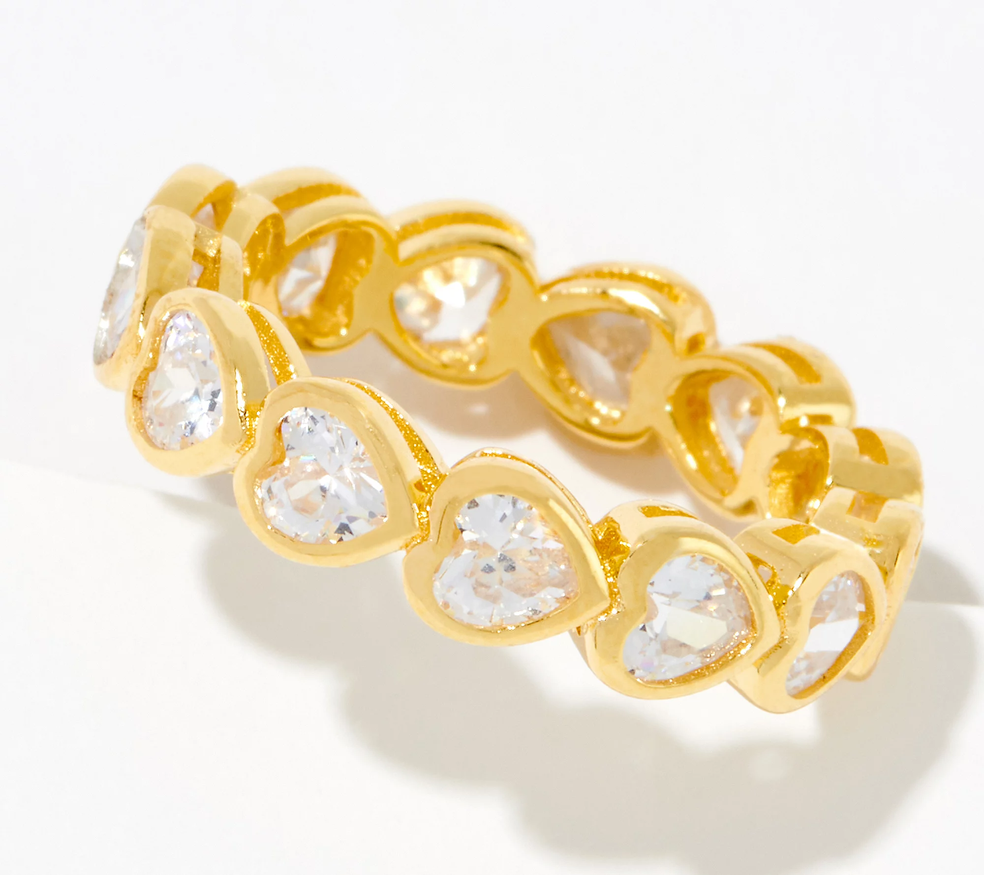 Este anillo de banda lineal con circonitas cúbicas Diamonique y diamantes de corte corazón simulados cautiva a todos (y mariposas ). Regala su belleza resplandeciente a quien tiene la llave de tu corazón.