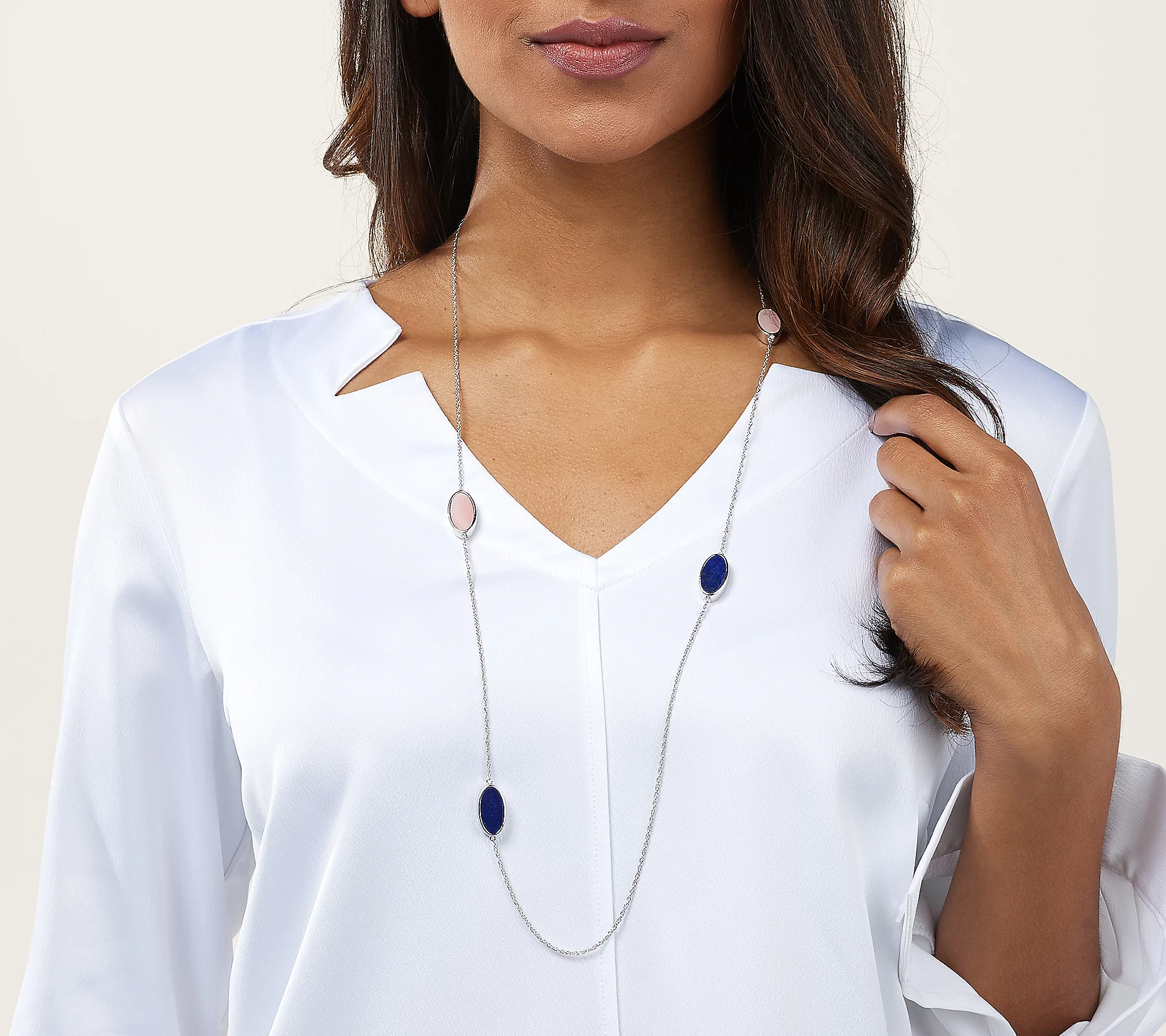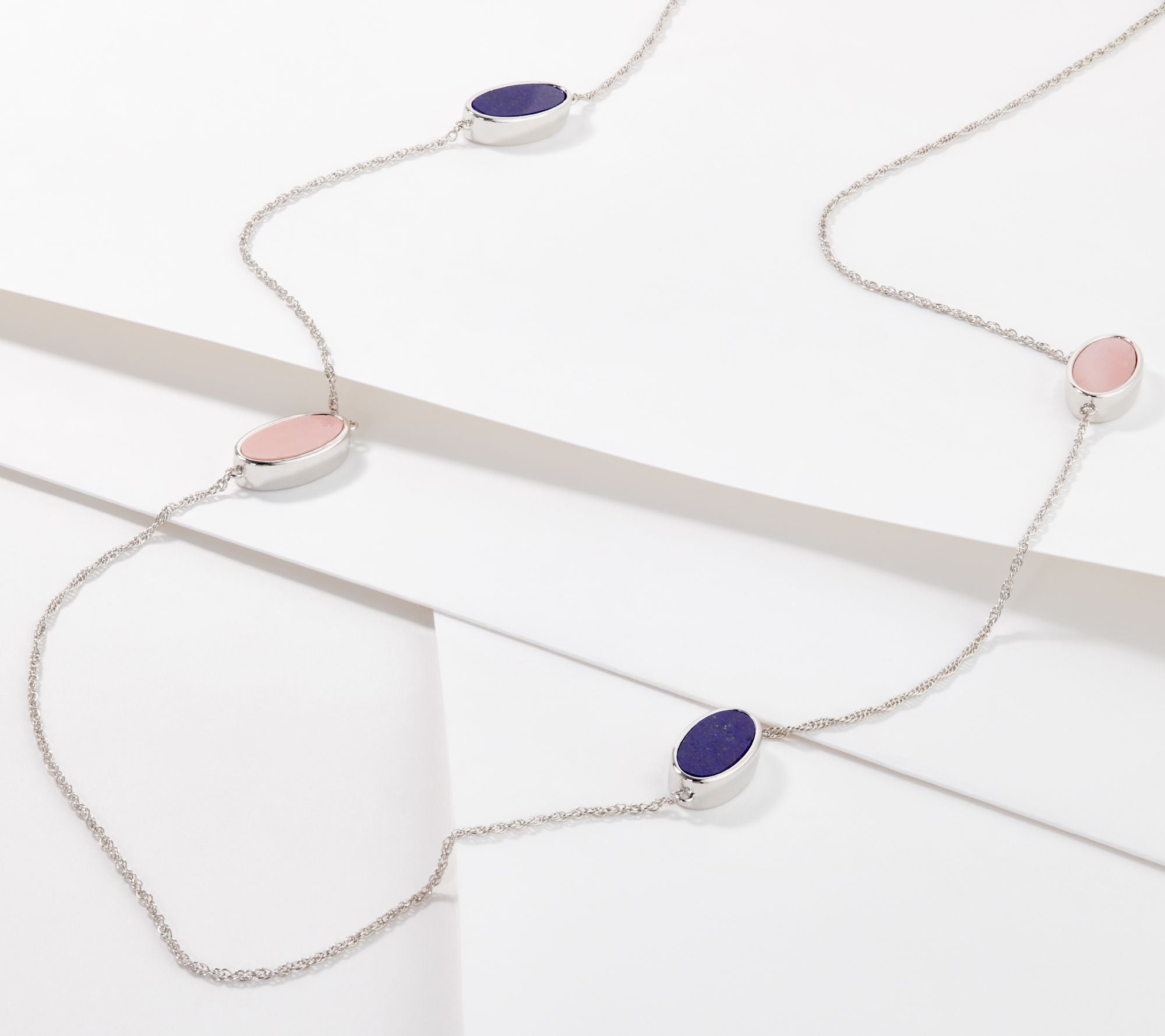 Collar reversible ovalado de plata esterlina con ópalo rosa y lapislázuli de Generation Gems: una hermosa fusión de color y artesanía.
