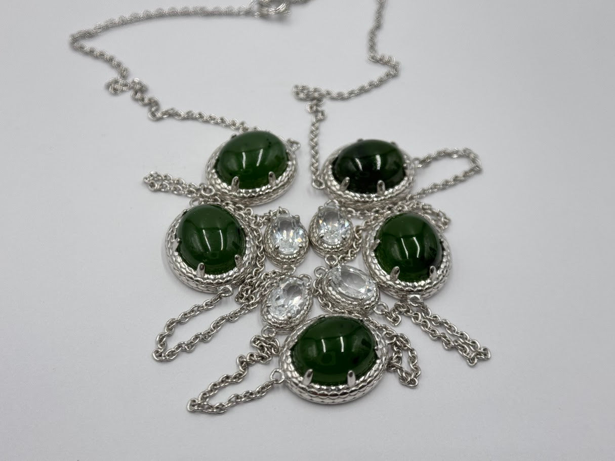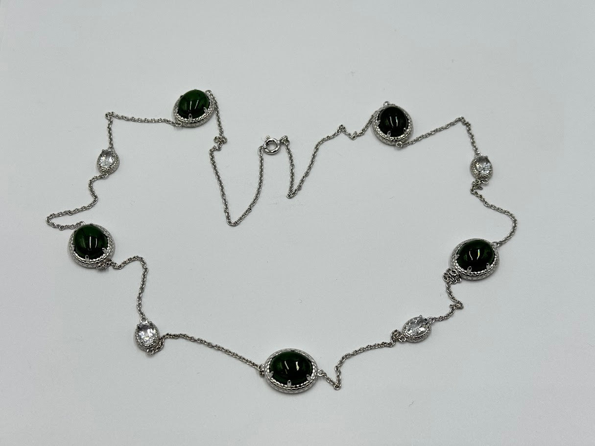 Timeless elegance and symbolic beauty shine in this Jade of Yesteryear station necklace. Featuring richly hued green jade accented with sparkling zircon stations, this long 28" design offers graceful movement and versatile styling. Crafted in polished sterling silver, the necklace reflects classic Asian-inspired artistry while remaining effortlessly wearable—perfect for layering or wearing as a standalone statement.
