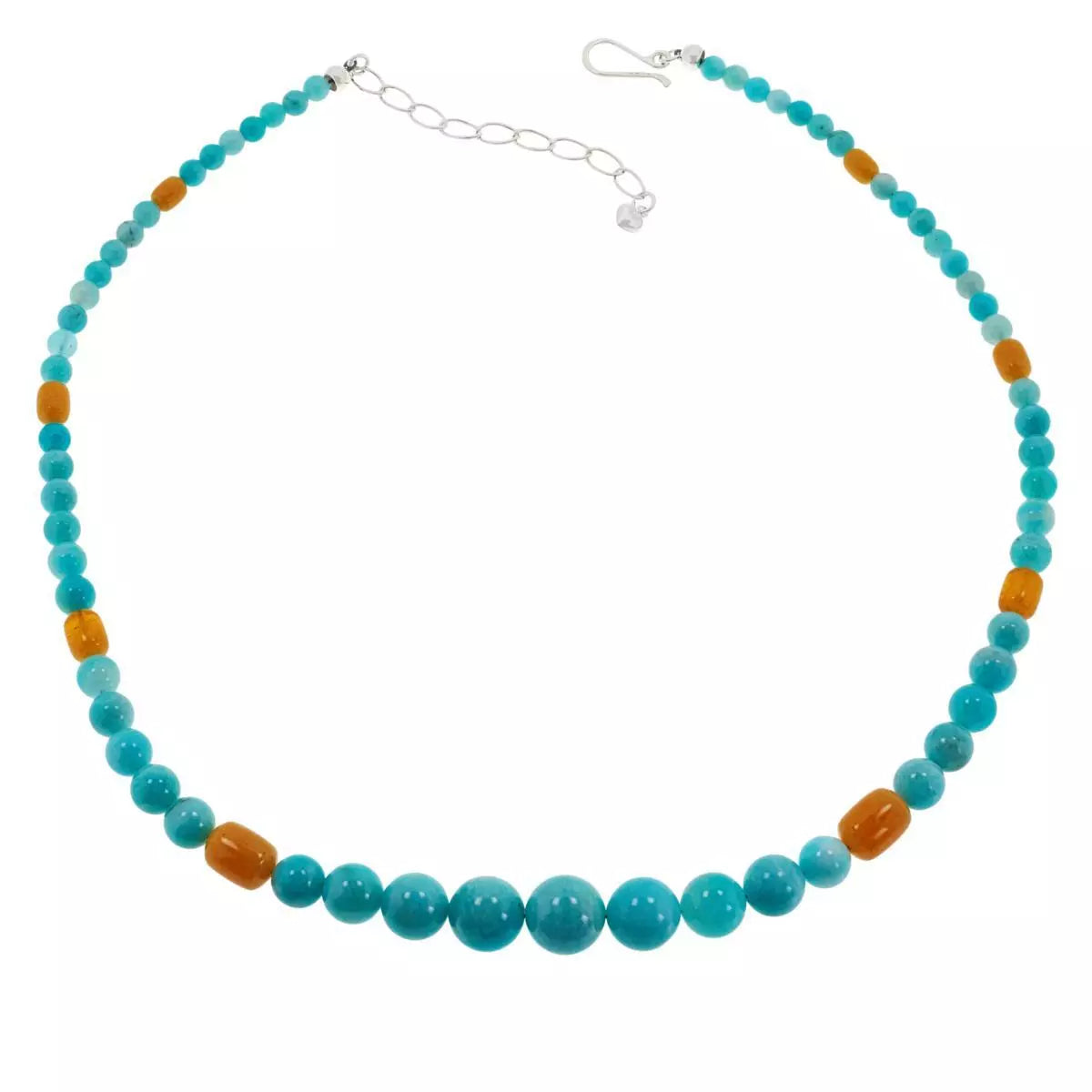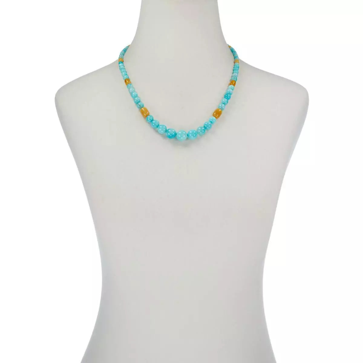 Añade un toque de belleza natural a tu colección de joyas con este impresionante collar de Jay King. Con una combinación de cuentas de amazonita y caramelo, esta pieza presenta una combinación única de colores y texturas.