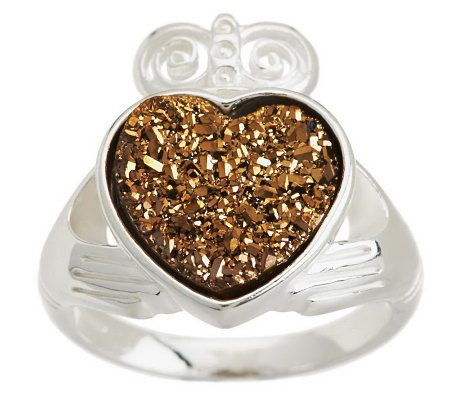 Cariño épico. Este espectacular anillo Claddagh de cuarzo drusa es una hermosa muestra de amor y cultura. Su diseño tradicional presenta una intrincada corona en espiral con manecillas caladas en el cuerpo.