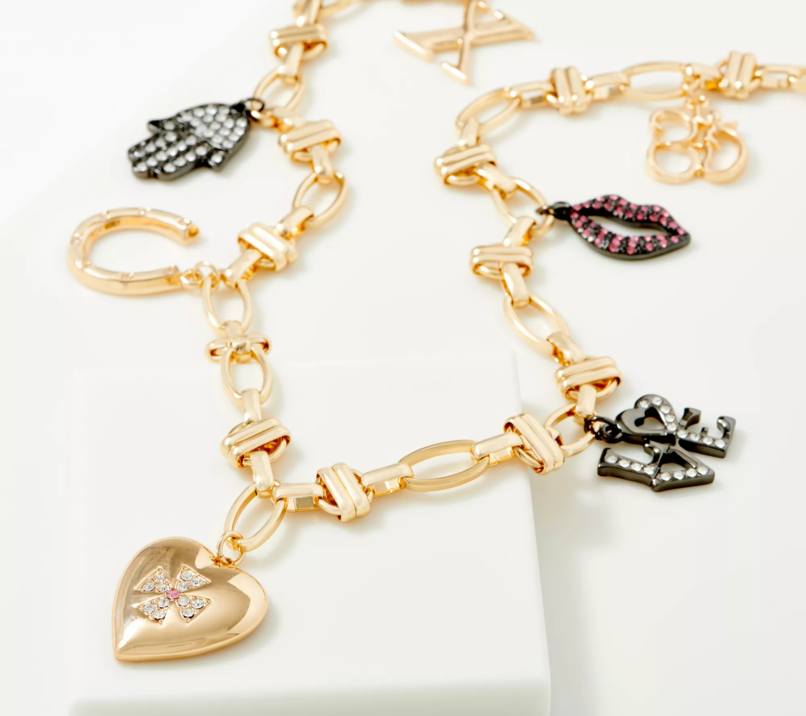 A celebration of Lori's legacy and energetic style, this inspired necklace boasts a bold array of distinctive crystal-accented charms. From LOGO Links by Lori Goldstein.