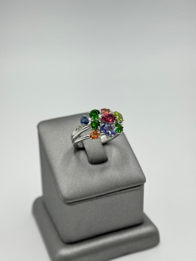 Crafted in solid 925 sterling silver with a high-polish finish, the setting enhances each gemstone’s brilliance while providing durability and long-lasting shine. The sculptural, multi-row design adds depth and dimension, allowing the colors to stand out beautifully from every angle. Sized at 8, this ring offers a comfortable fit with unmistakable designer presence.