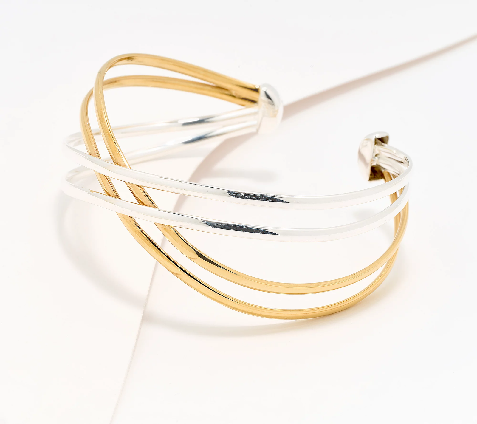 Elevate your everyday outfits or special occasion looks with this eye-catching crossover cuff bracelet, featuring a semi-rigid, multi-layered design. From Ultrafine® 950 Silver Nickel-Free Jewelry.