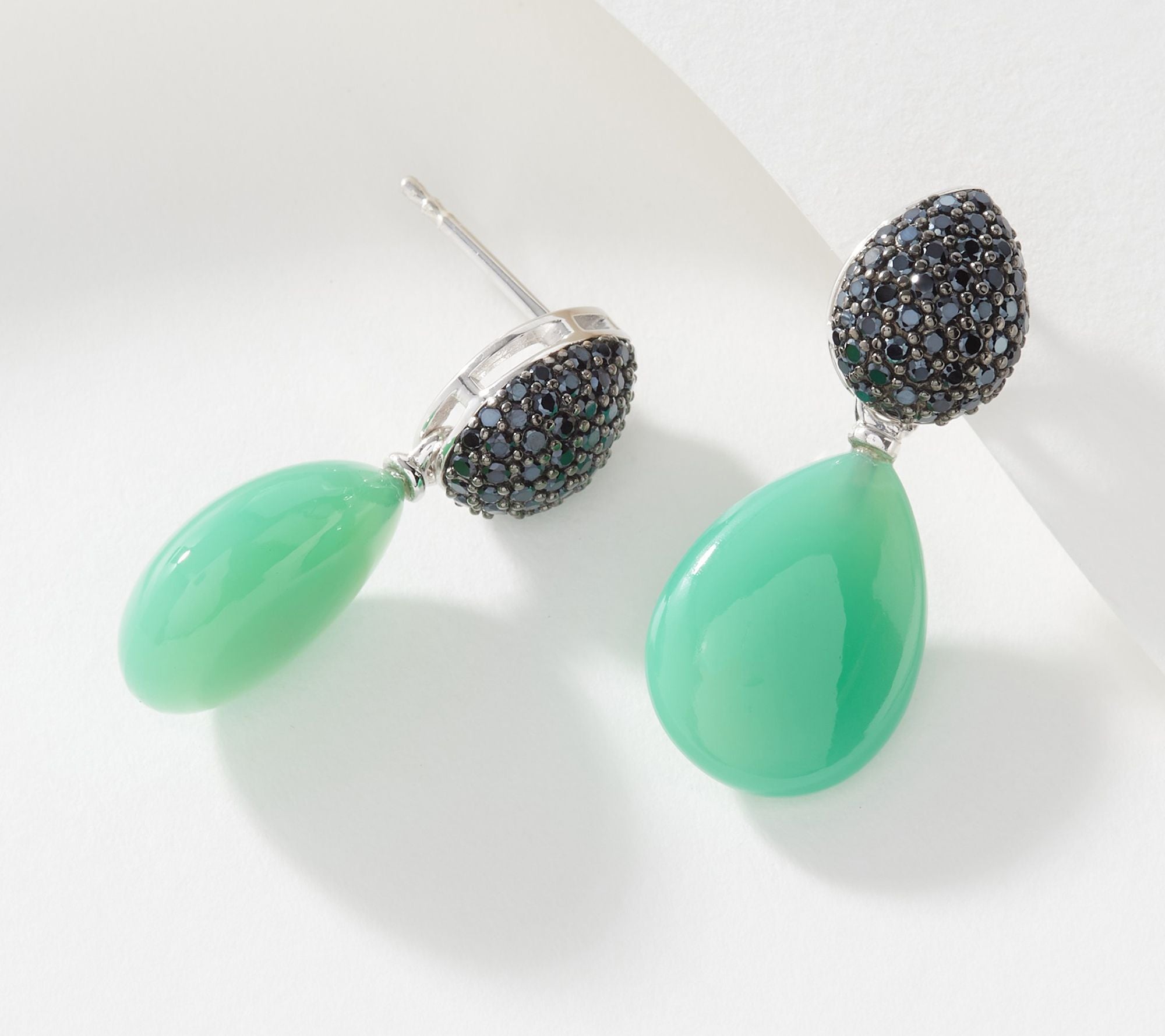 Simply brilliant. The stud design of these drop earrings sparkles with small, round, faceted gemstones, while a pear-shaped cabochon hangs handsomely below.