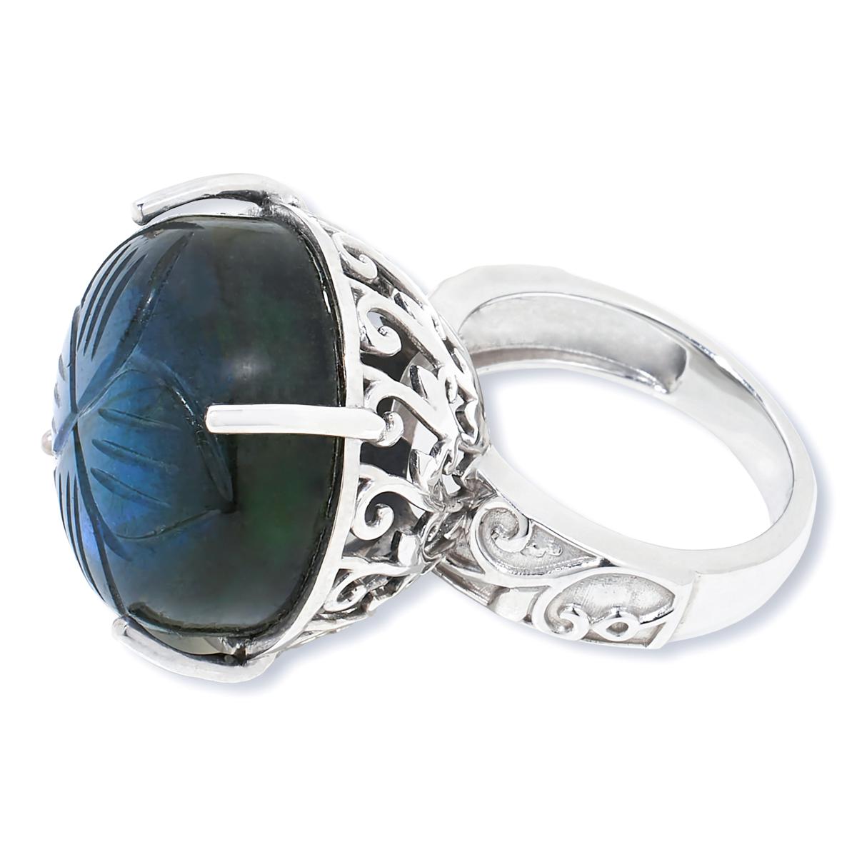 Add a touch of the exotic to your jewelry accessories' collection with this fun, floral-inspired labradorite ring. The pretty piece features a carved cabochon of shimmering labradorite, nestled within an elaborate, cut-out scrollwork design.