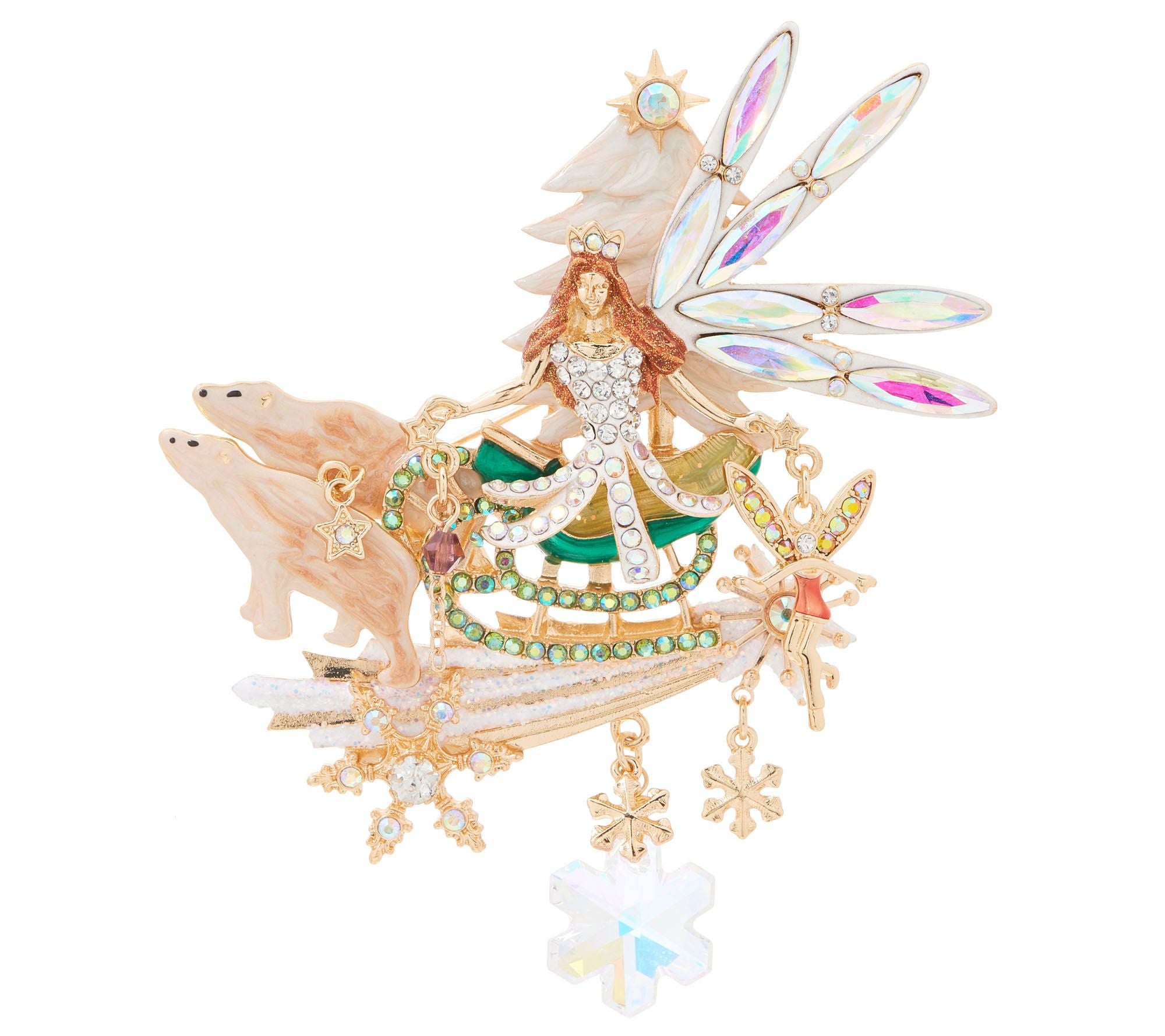 Let your whimsy take flight with this pin enhancer featuring the Delphine fairy. Led by a pair of bears, the glittery sleigh is decorated with colorful enamel, dangling charms, and crystals. From Kirks Folly.