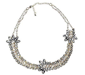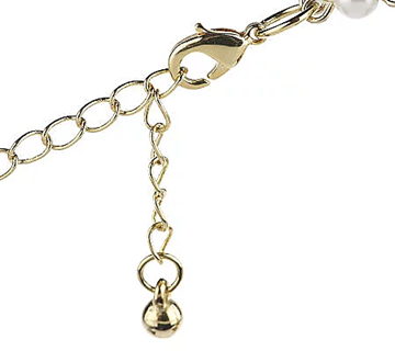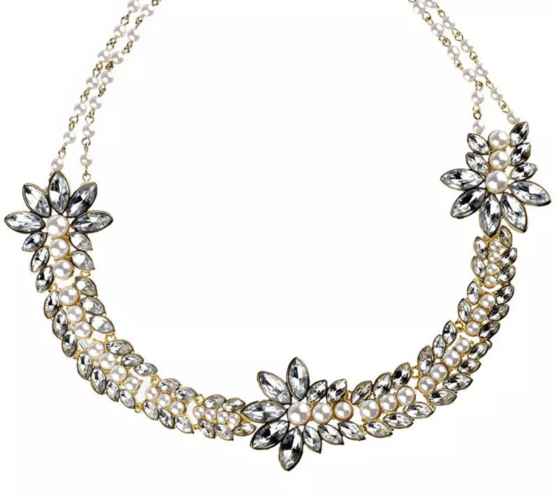 Magical moment. This goldtone necklace has the power to transform your look with its radiant beauty. Luminous, round, simulated pearls and gleaming sections of curved links accented with faceted, marquise-shaped, simulated stones are arranged in an enchanting graduated pattern. And a double strand of round, simulated pearls connected by pigtail links finishes the look with a flourish. From Rachel Zoe.