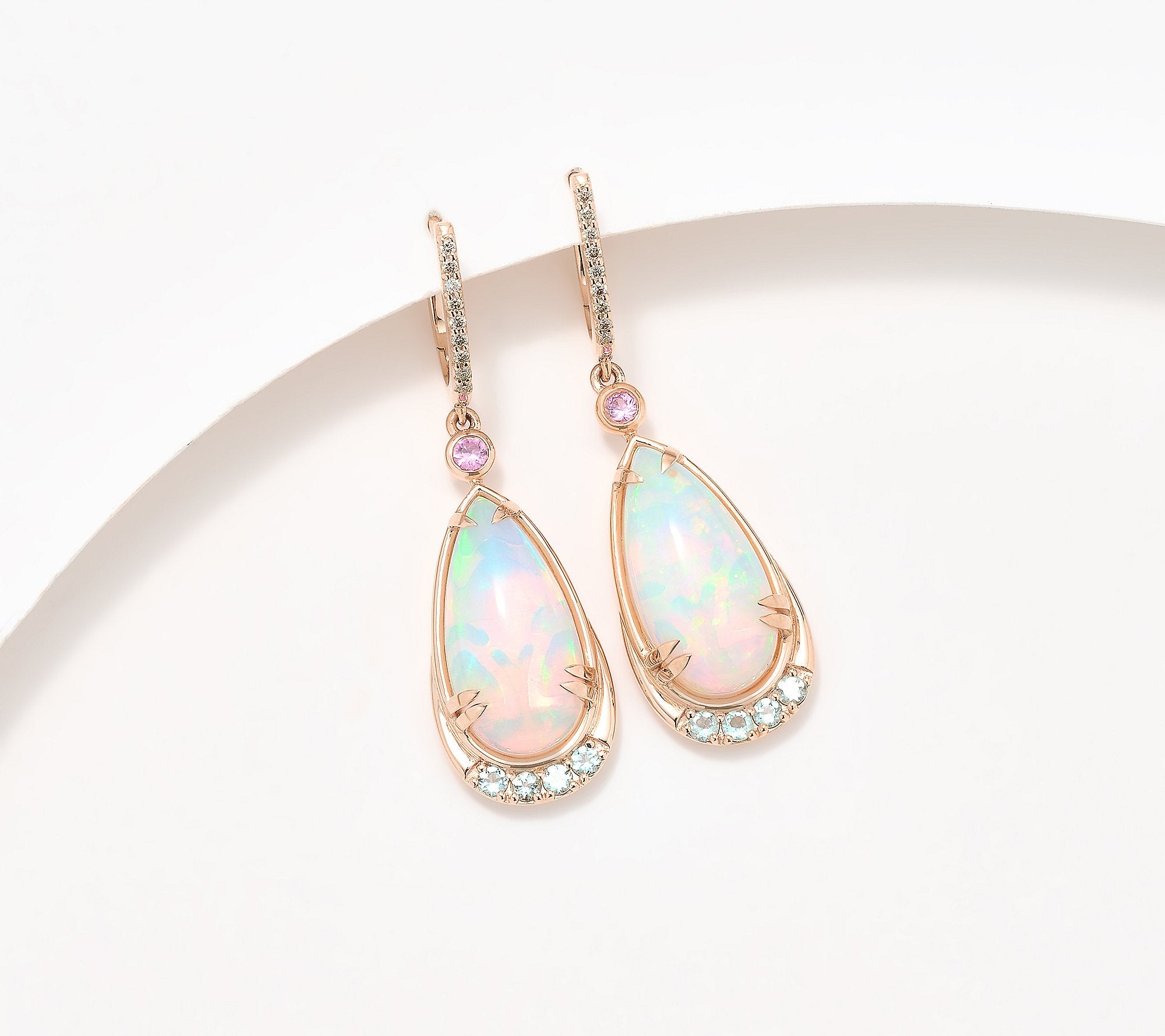 Your big moment has arrived. Accessorize in these Ethiopian opal earrings - a drop design highlighted by pink sapphire, aquaiba, and light brown diamonds -- and embrace a beauty that you (and they) will never forget. From Gem Discoverer.