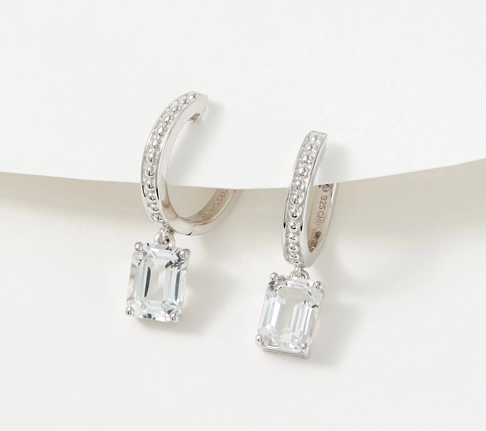 Embrace a look-at-me attitude with these huggie hoop earrings accented with a brilliant beaded texture. Then take it one step further with an eye-catching emerald-cut gemstone drop for added emphasis.