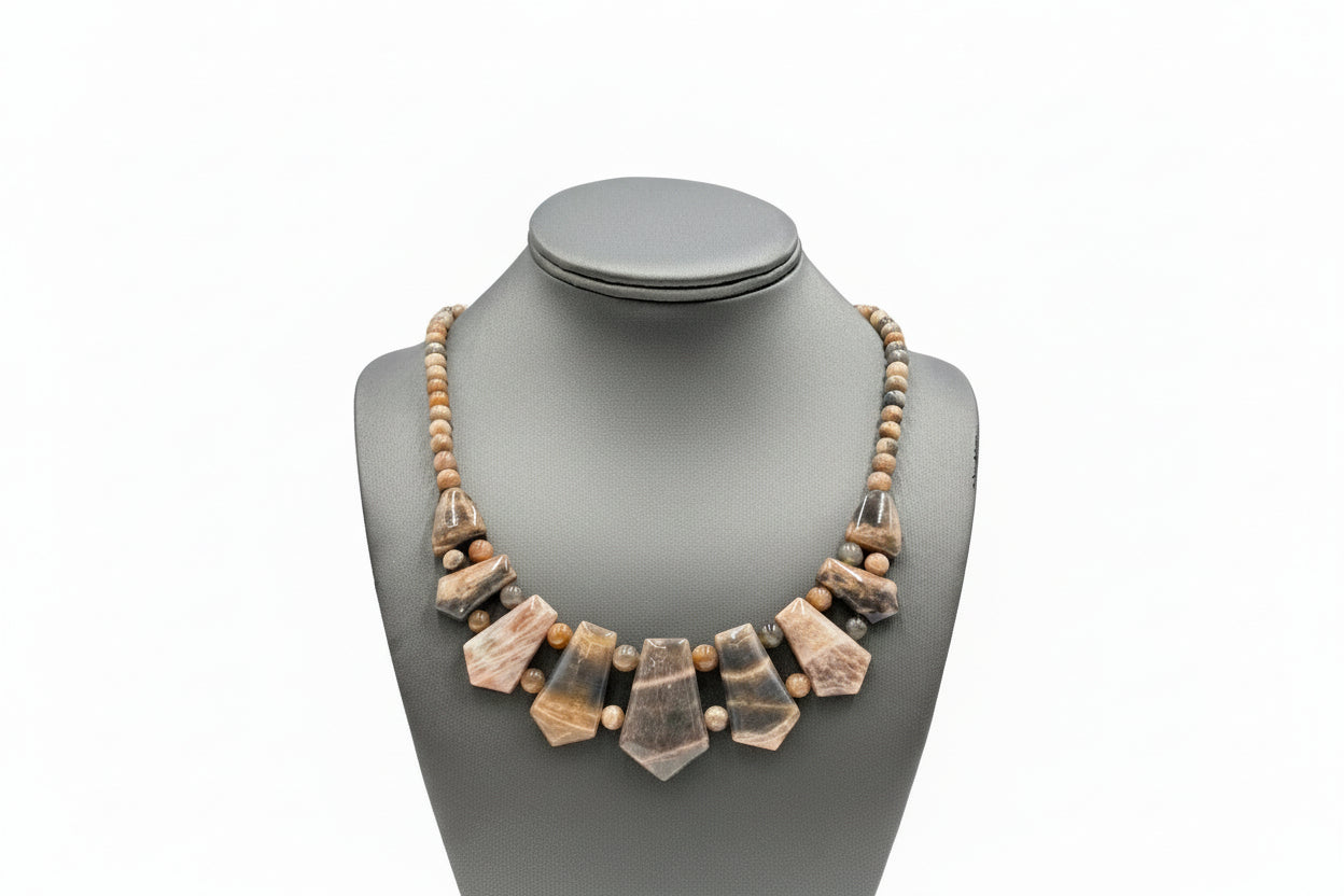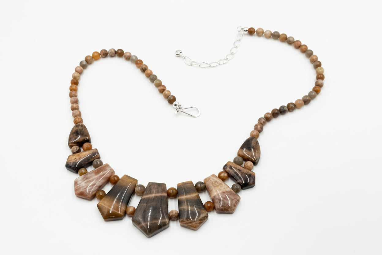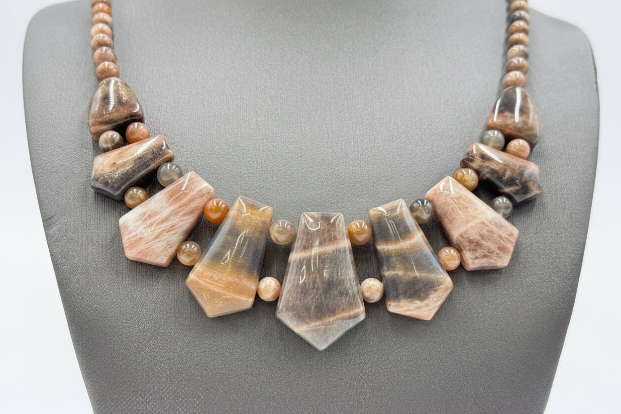 Each Cat’s Eye moonstone displays a mesmerizing chatoyancy, revealing luminous bands of light that move across the stone’s surface in warm shades of brown, gold, and caramel. The design features elongated, pentagon-shaped stations complemented by smooth, round beads that catch the light beautifully from every angle.