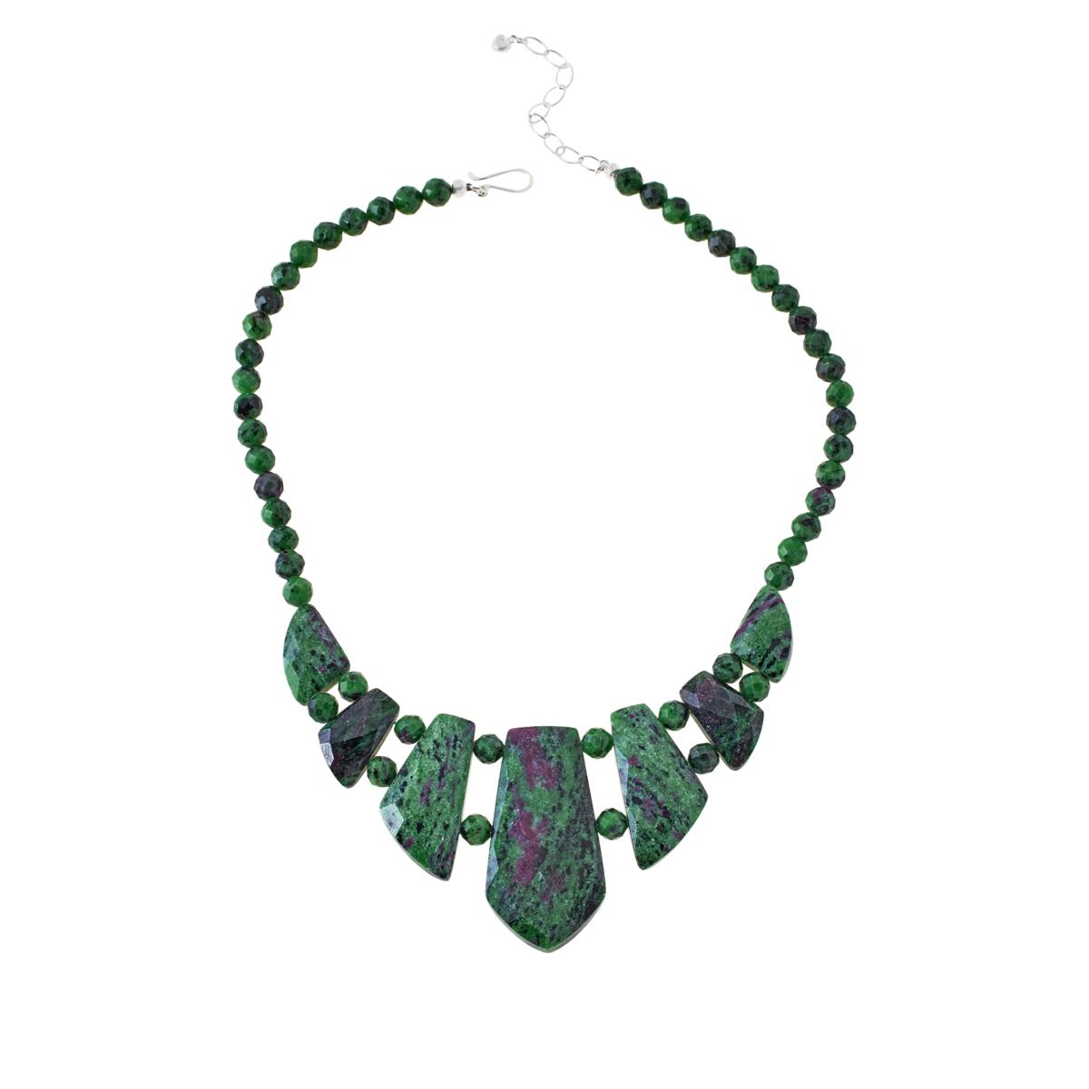 Make a bold and elegant statement with the Jay King Green Tanzanian Zoisite Necklace, a striking piece featuring rare green and black zoisite gemstones from Tanzania. The freeform-cut stations and faceted round bead spacers showcase the natural beauty of this unique gemstone, making this necklace a stunning addition to any jewelry collection.