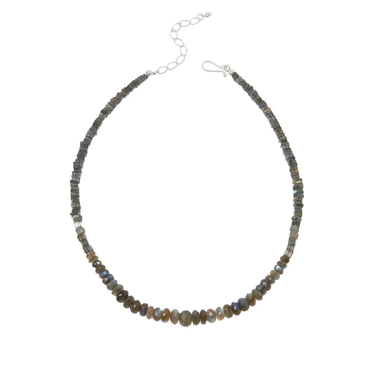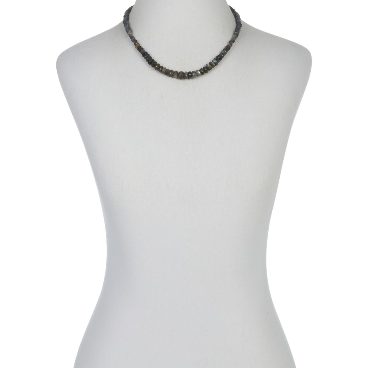 Elevate your jewelry collection with this shimmering Labradorite Beaded Necklace, crafted from silvery-gray labradorite sourced from Madagascar. Featuring three distinct bead cuts and a graduated profile, this necklace adds a sophisticated and versatile accent to your wardrobe.