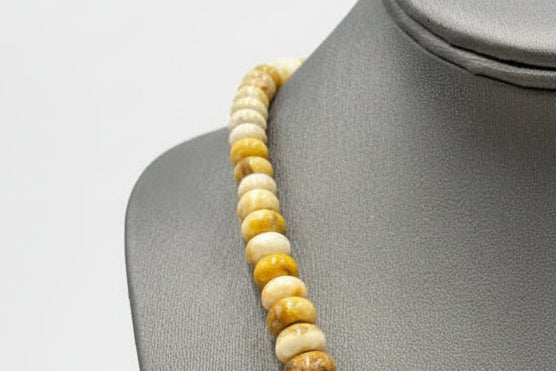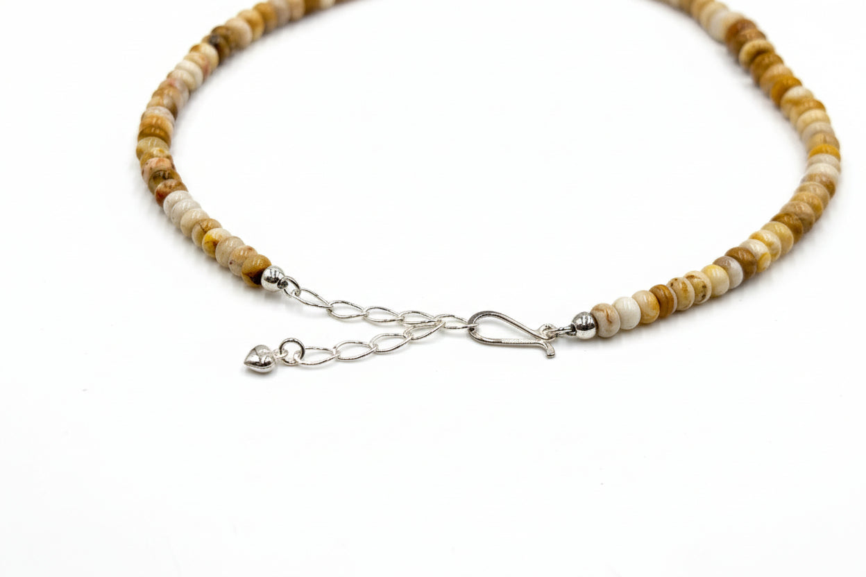 Each agate gemstone features unique, naturally banded patterns in soft white, taupe, and brown tones — a soothing neutral palette that complements every wardrobe. The necklace showcases five striking freeform stations, beautifully balanced by rondelle-shaped agate beads that complete the drape.