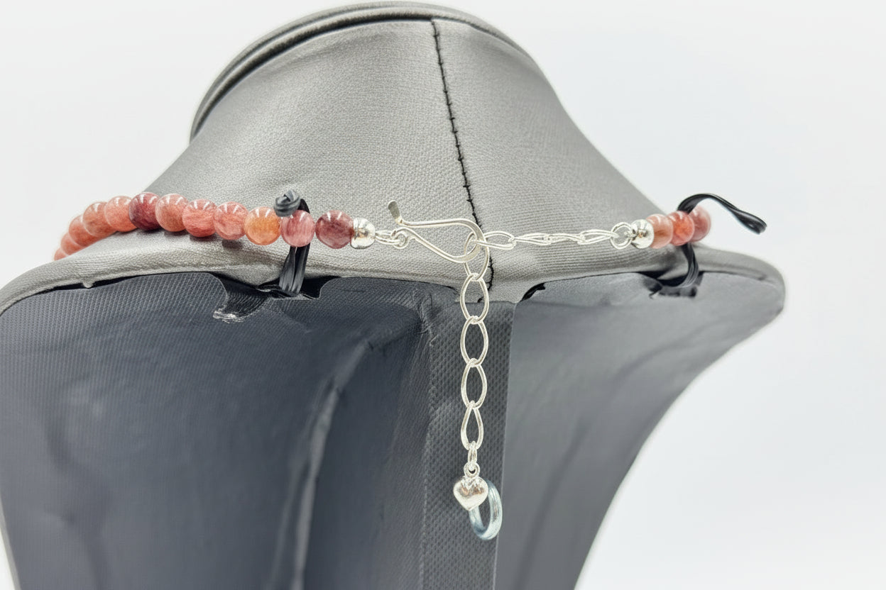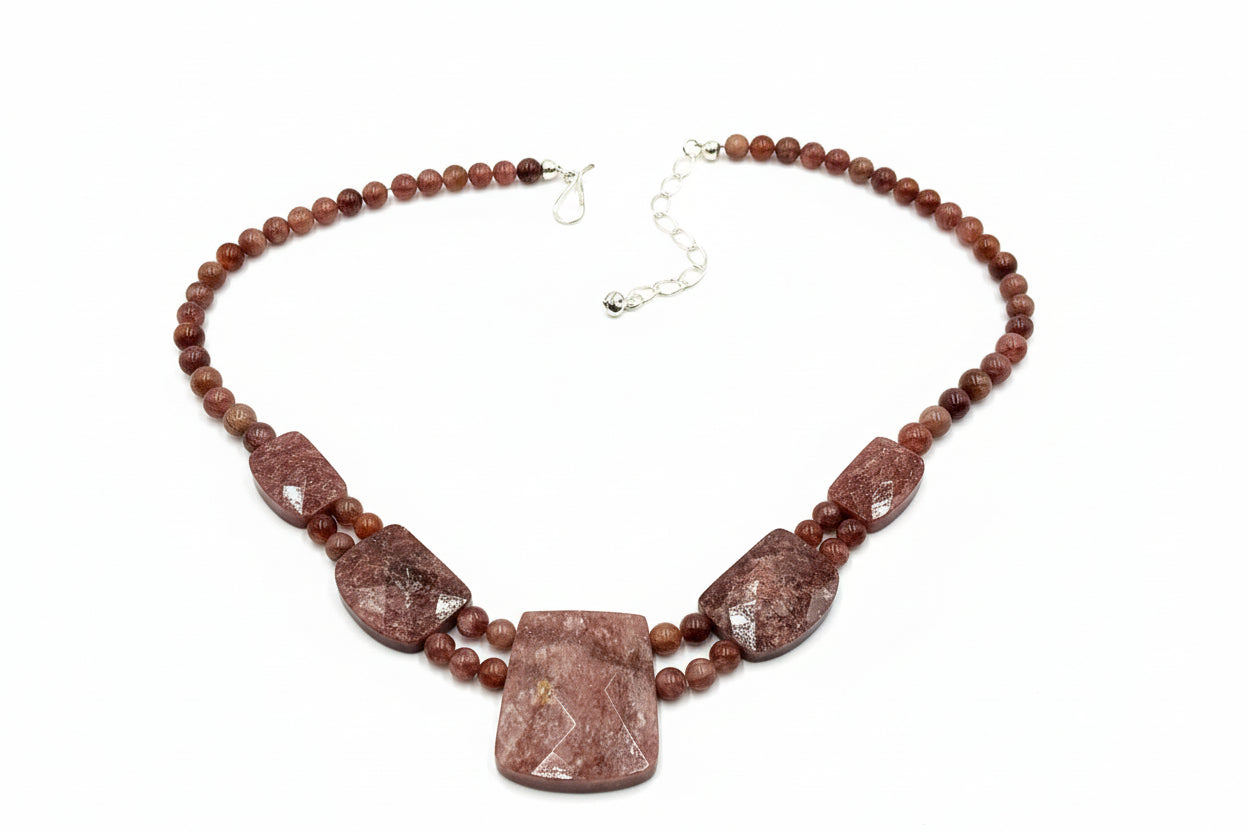 Featuring freeform pink quartzite stones with mottled strawberry-like tones, this necklace captures the warmth and energy of natural gemstones. The five large freeform stations are balanced by polished round beads, all strung by hand to highlight their organic texture and beautiful color variations.