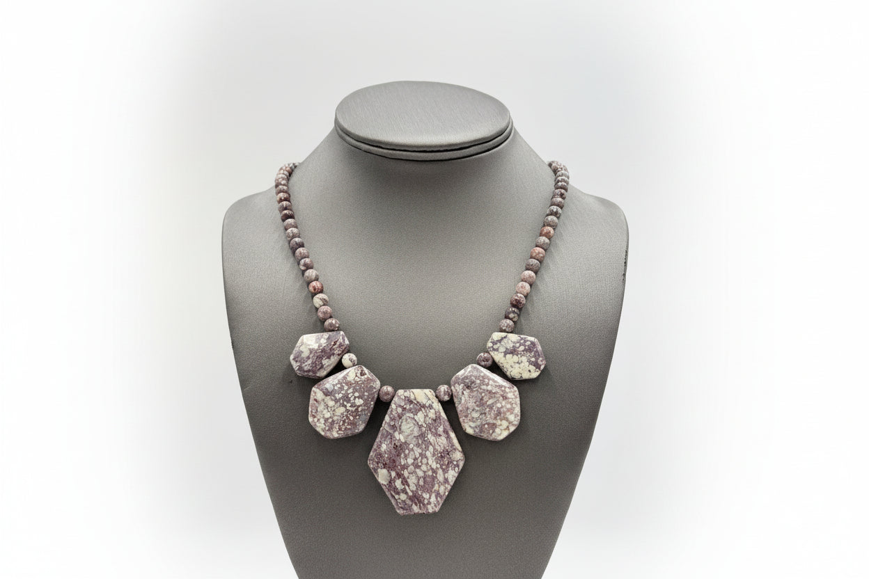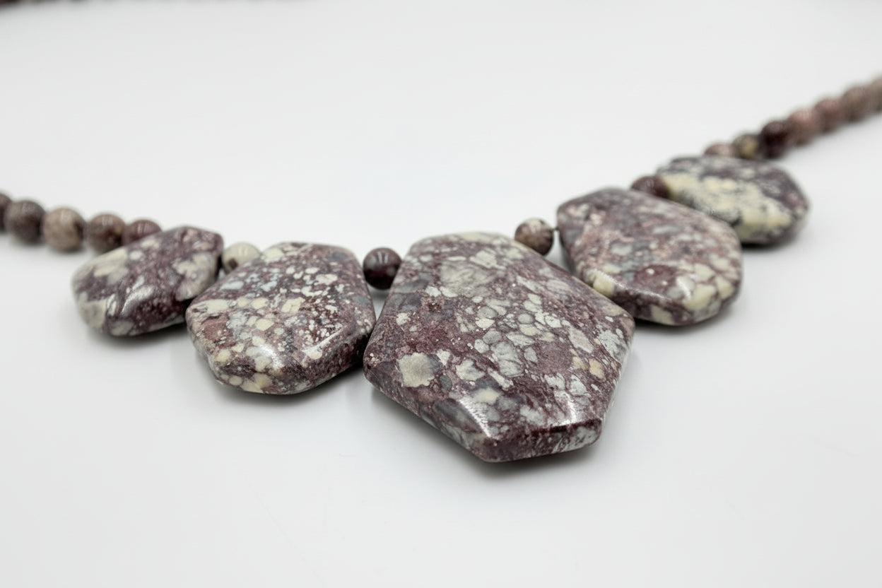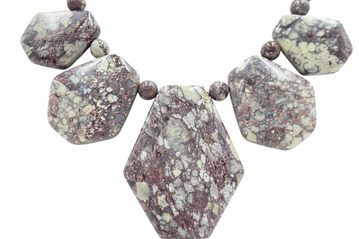every piece truly one-of-a-kind. The design features five bold, freeform stations of Tawny Port Stone, graduating toward the center for balance and movement. Smooth, round matching beads complete the strand for a seamless, polished look.