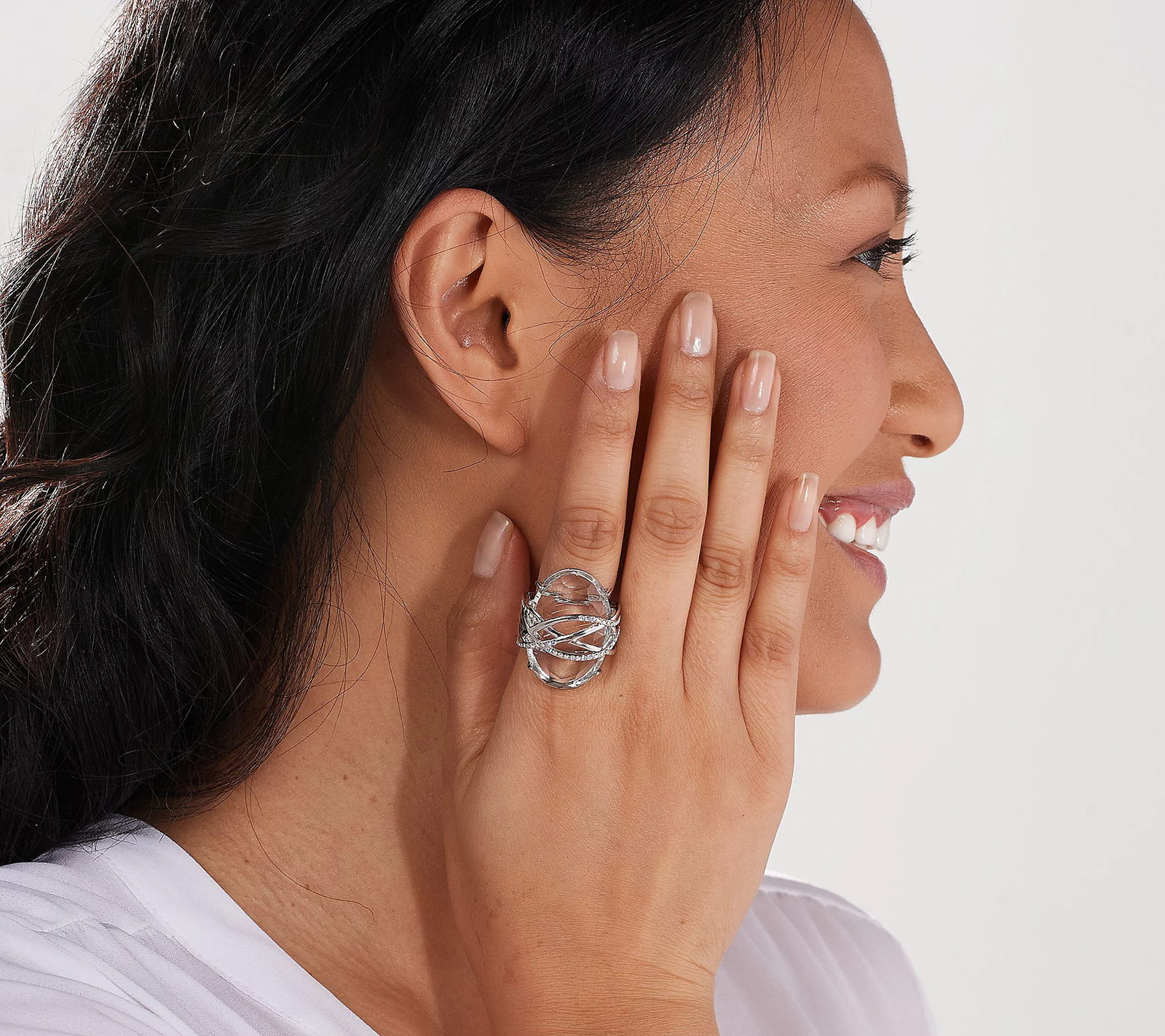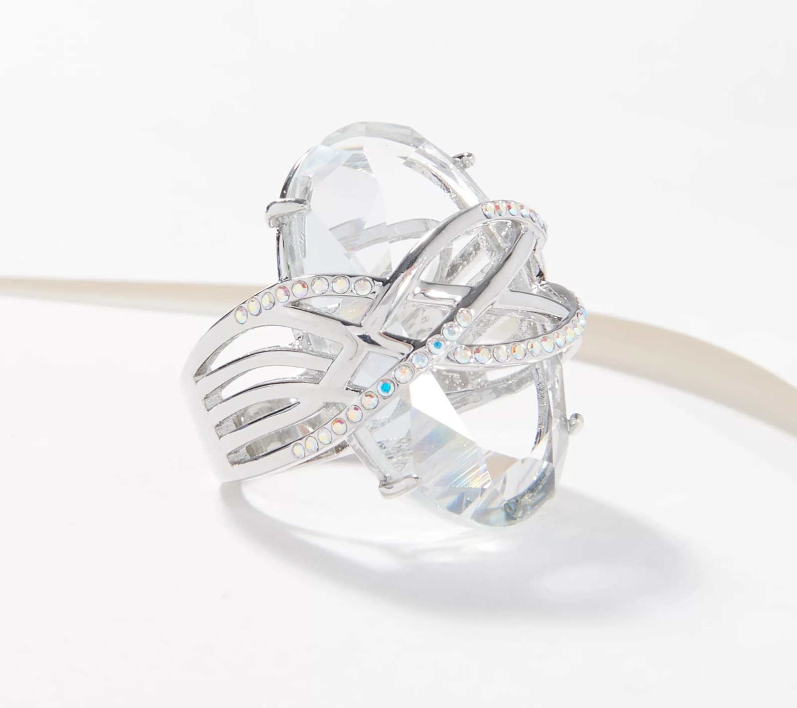 File this ring under "Bold and Beautiful". The jaw-dropping crystal clear cabochon inside this ring is caged by a swirling bypass design and, of course, accented with signature aurora borealis. From Kirks Folly.