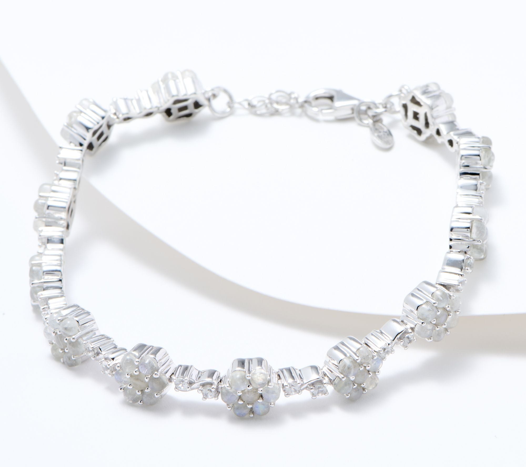 Send yourself flowers – the sparkling kind! This charming bracelet from Affinity® Gems blooms with shimmering moonstone cabochons and twinkling white zircon, arranged in a graceful floral design that’s sure to brighten any jewelry collection.