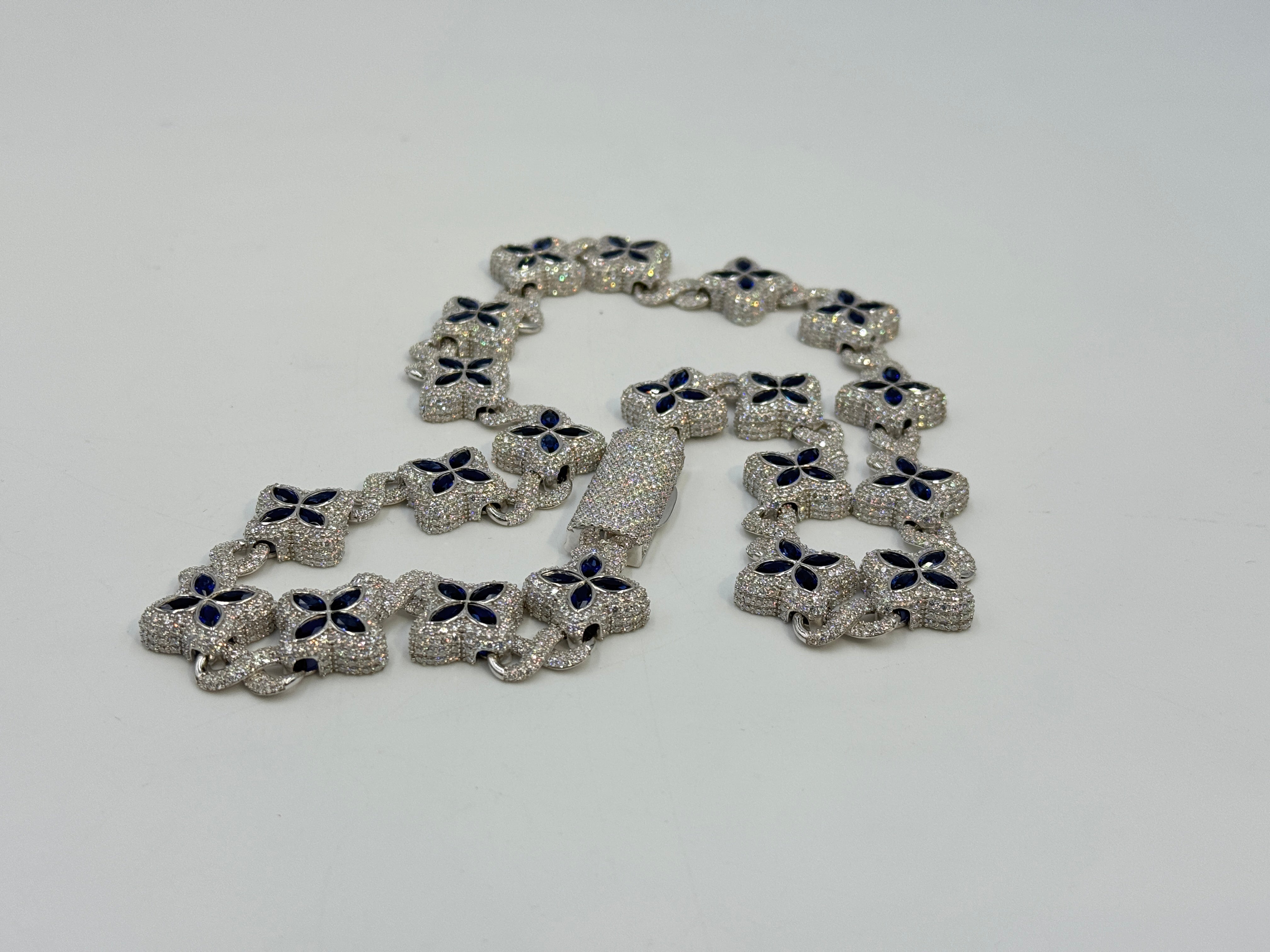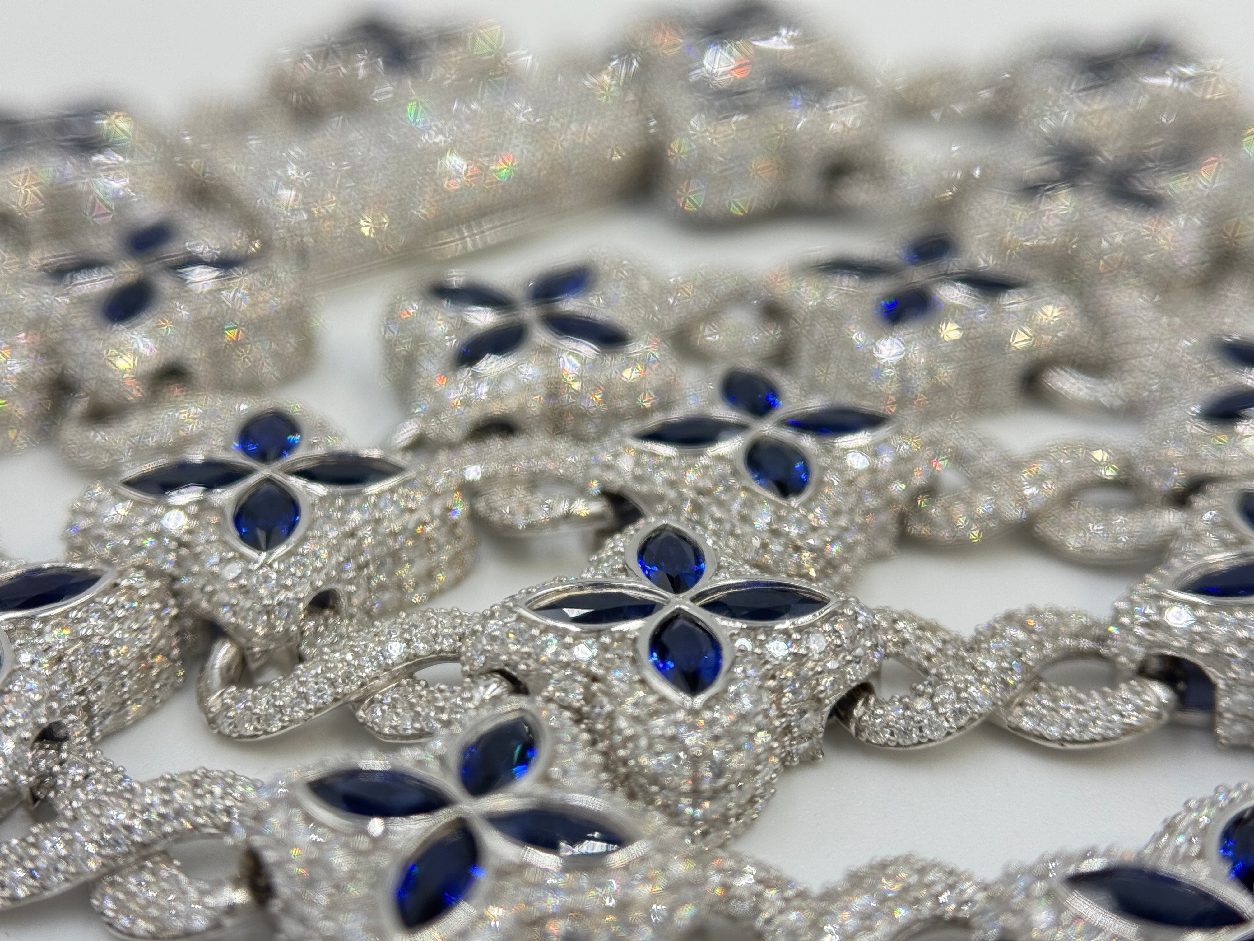 At the center of each clover motif are marquise-cut Blue Sapphire Cubic Zirconia stones, adding a deep royal-blue hue and refined contrast that elevates the design beyond traditional iced chains. Between each floral element, infinity-style links provide smooth articulation, enhanced comfort, and a continuous, flowing appearance.