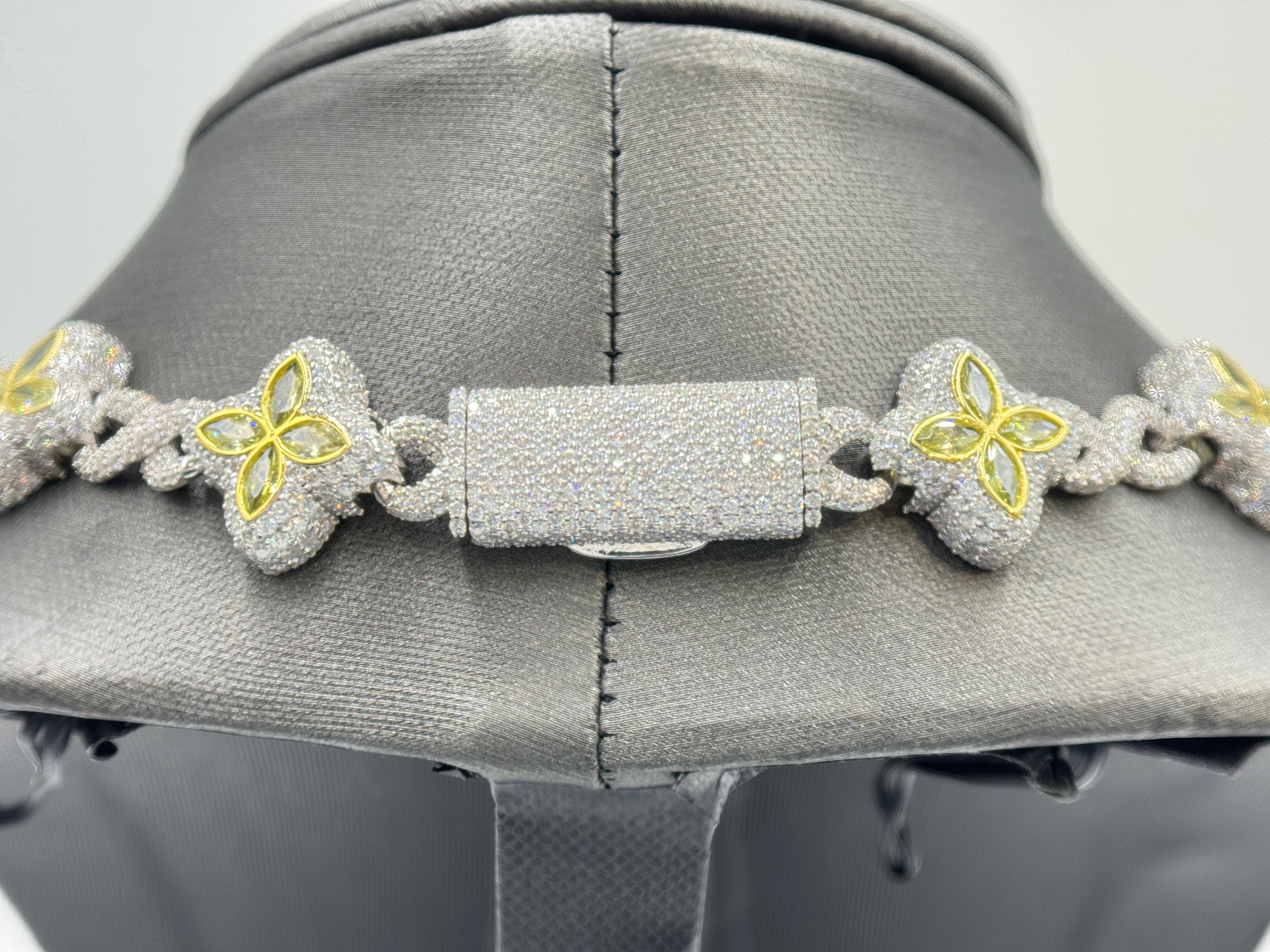At the center of each clover motif are marquise-cut Citrine Cubic Zirconia stones, delivering rich golden-yellow tones that stand out vividly against the iced Moissanite surface. Connecting each floral element are infinity-style links, adding symbolic meaning, fluid articulation, and a continuous visual rhythm throughout the chain.