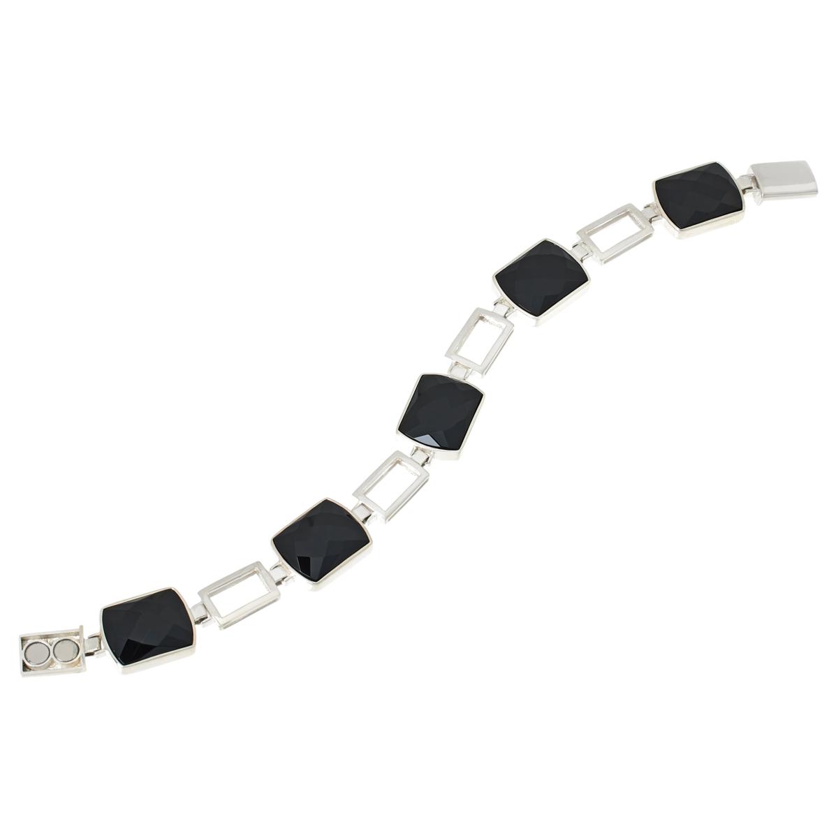 Handcrafted in solid sterling silver (.925), the design features barrel-shaped gemstone stations alternating with square open links, creating a bold yet wearable silhouette. A secure magnetic closure makes this bracelet as practical as it is striking.