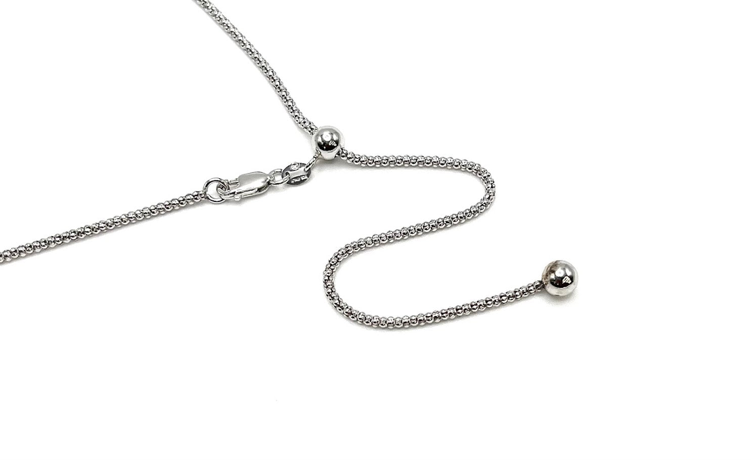 Chain: 30" L x 1/16" W sterling silver popcorn chain with a 2" extender, adjustable via a sliding bead