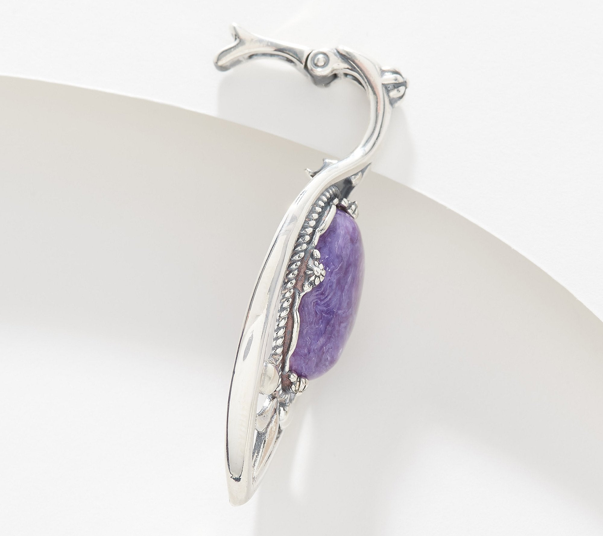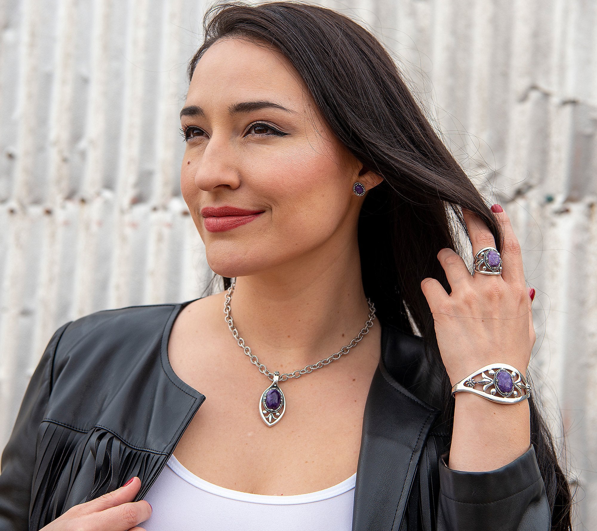 If you have a passion for all things purple, then this charoite enhancer is calling your name. The squash blossom and beaded details make a most-fitting framework for the captivating, can't-quite-take-your-eyes-off-it cabochon. From American West Jewelry.