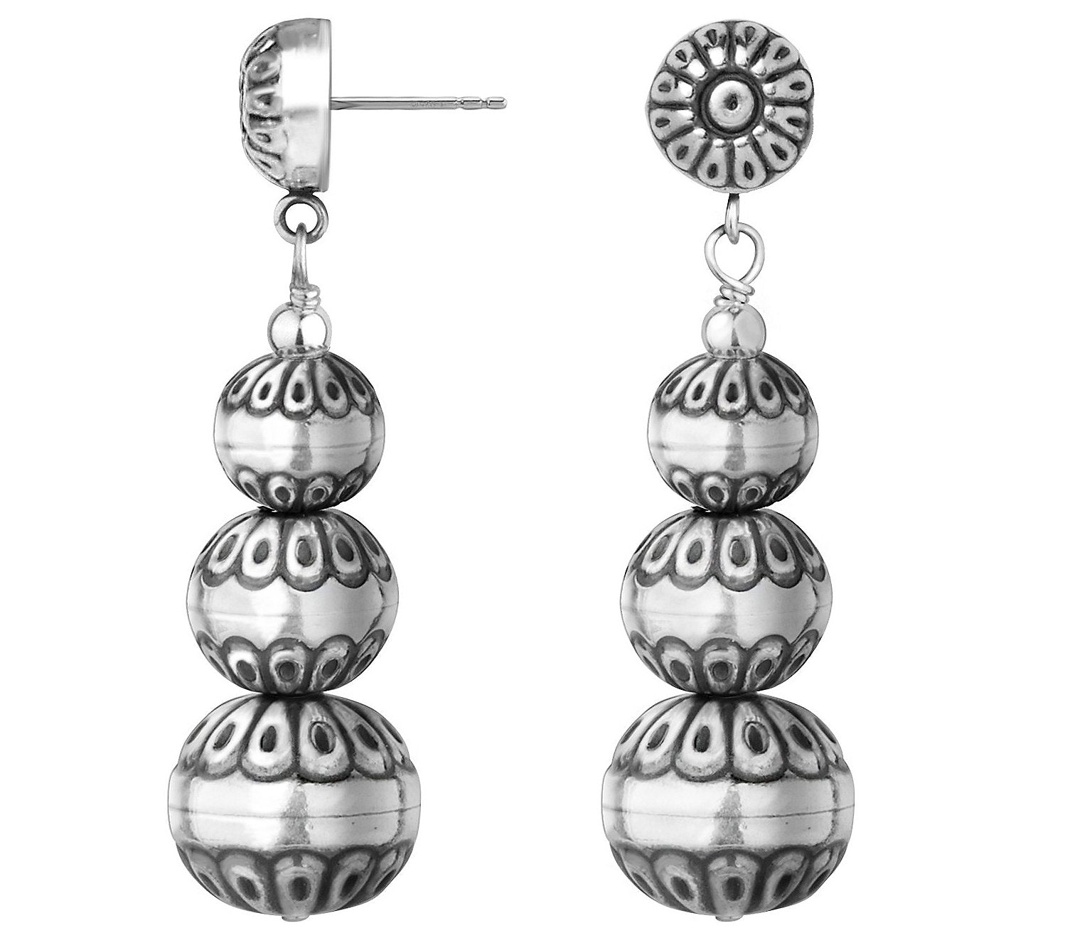 Authentic American West Design: Featuring concha-style posts with 3 graduated, stamped native pearl beads in oxidized sterling silver.