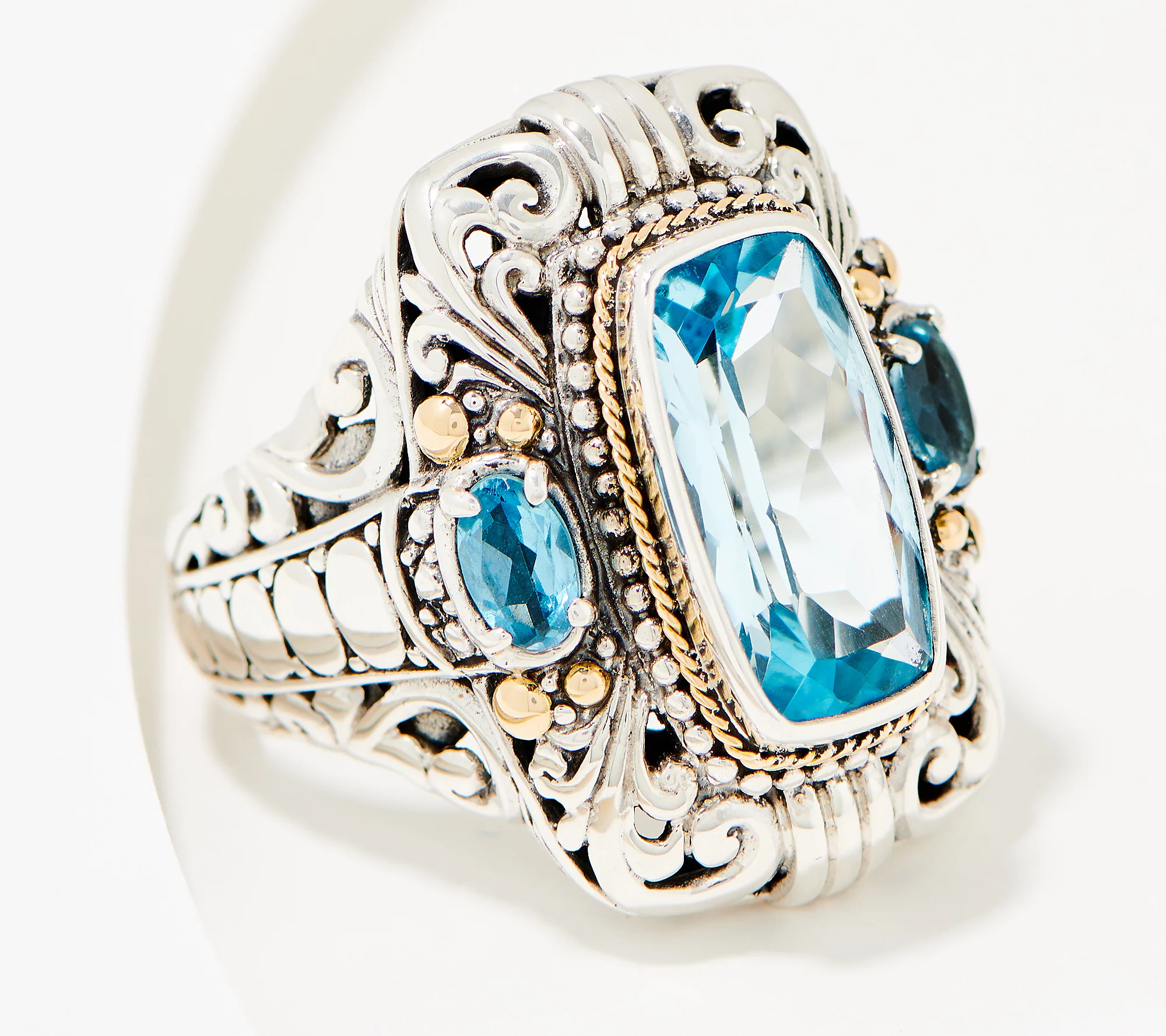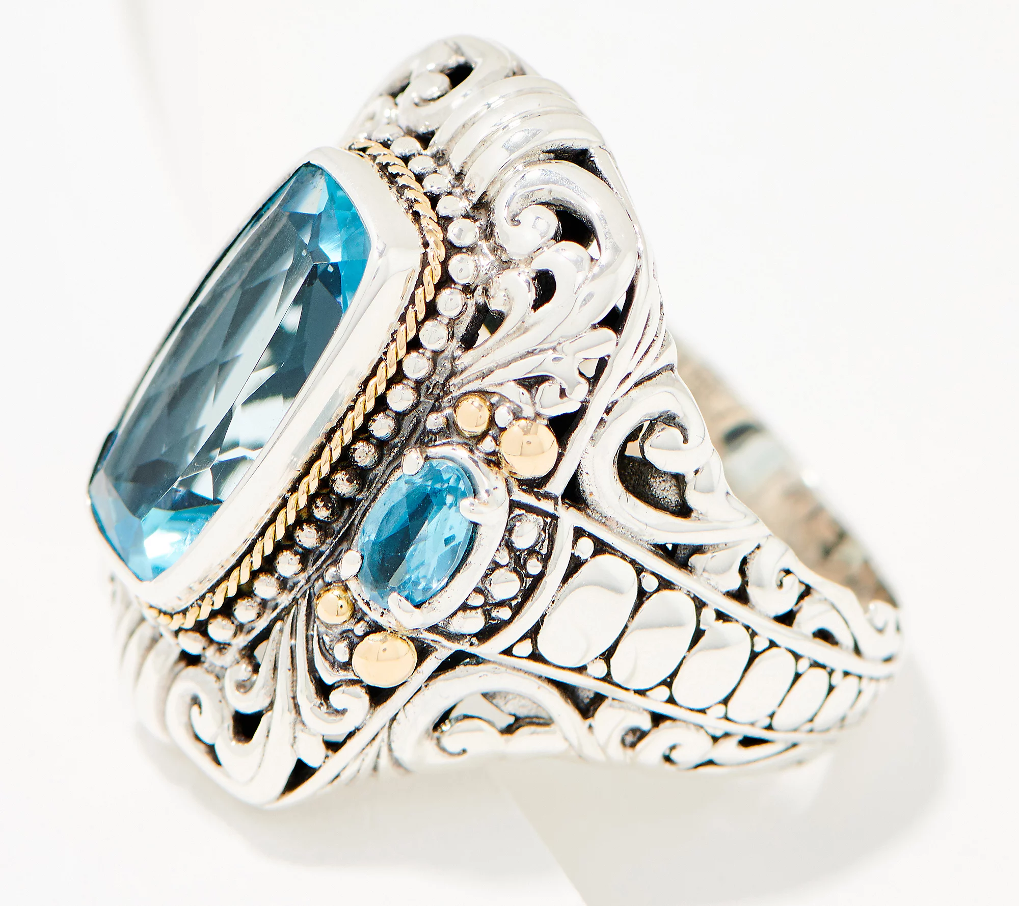 Intricate scrollwork combined with 18K gold accents and beautiful blue topaz give this ring a captivating finish that will capture the heart of any jewelry aficionado.