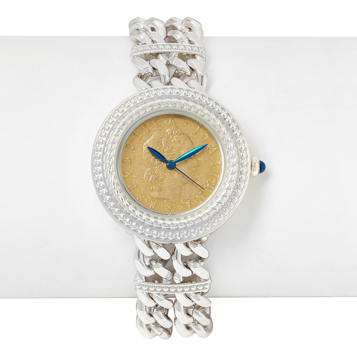 Bellezza Silvertone Women's 50 Lira Coin Cuban-Link Bracelet Watch – Blue CZ Accents