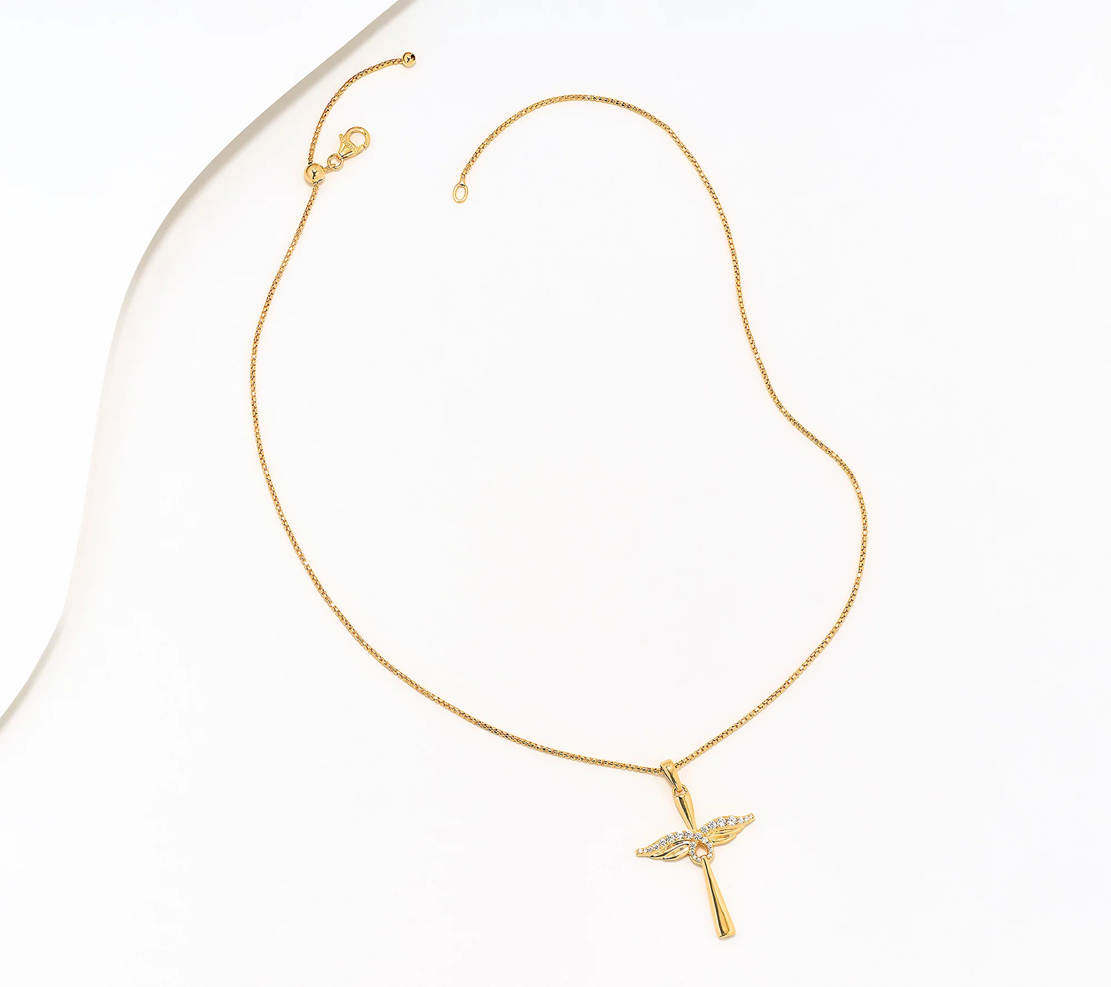 Treat yourself to a beautiful reminder that your angel is always near with this stunning angel wing cross necklace. The shiny pendant, set on an easy-to-adjust box chain, gleams with richly detailed wings and sparkling white topaz gemstones. From David Markstein.