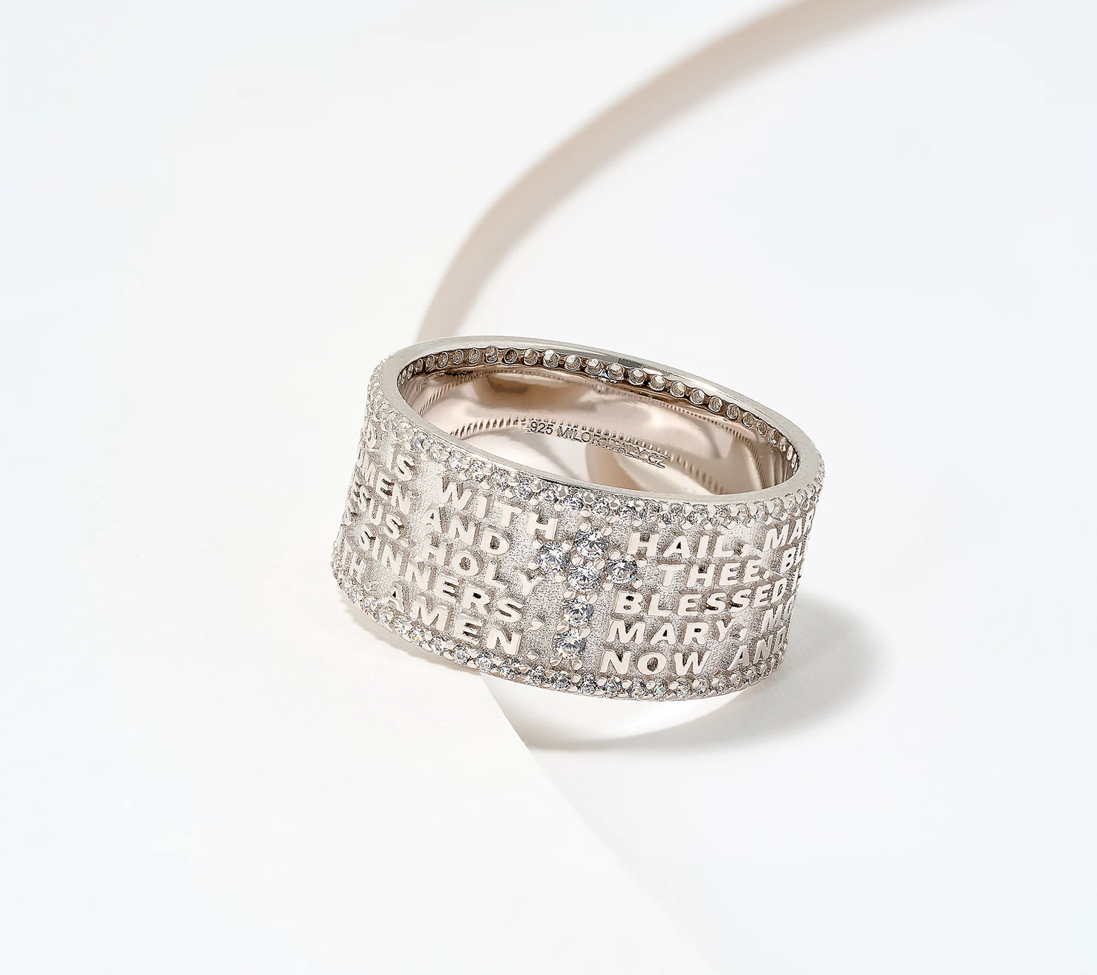 Whether you're taking a moment for reflection or sharing blessings during gatherings, this made-in-Italy prayer band ring celebrates your faith with its engraved Hail Mary prayer and shimmering cross design.