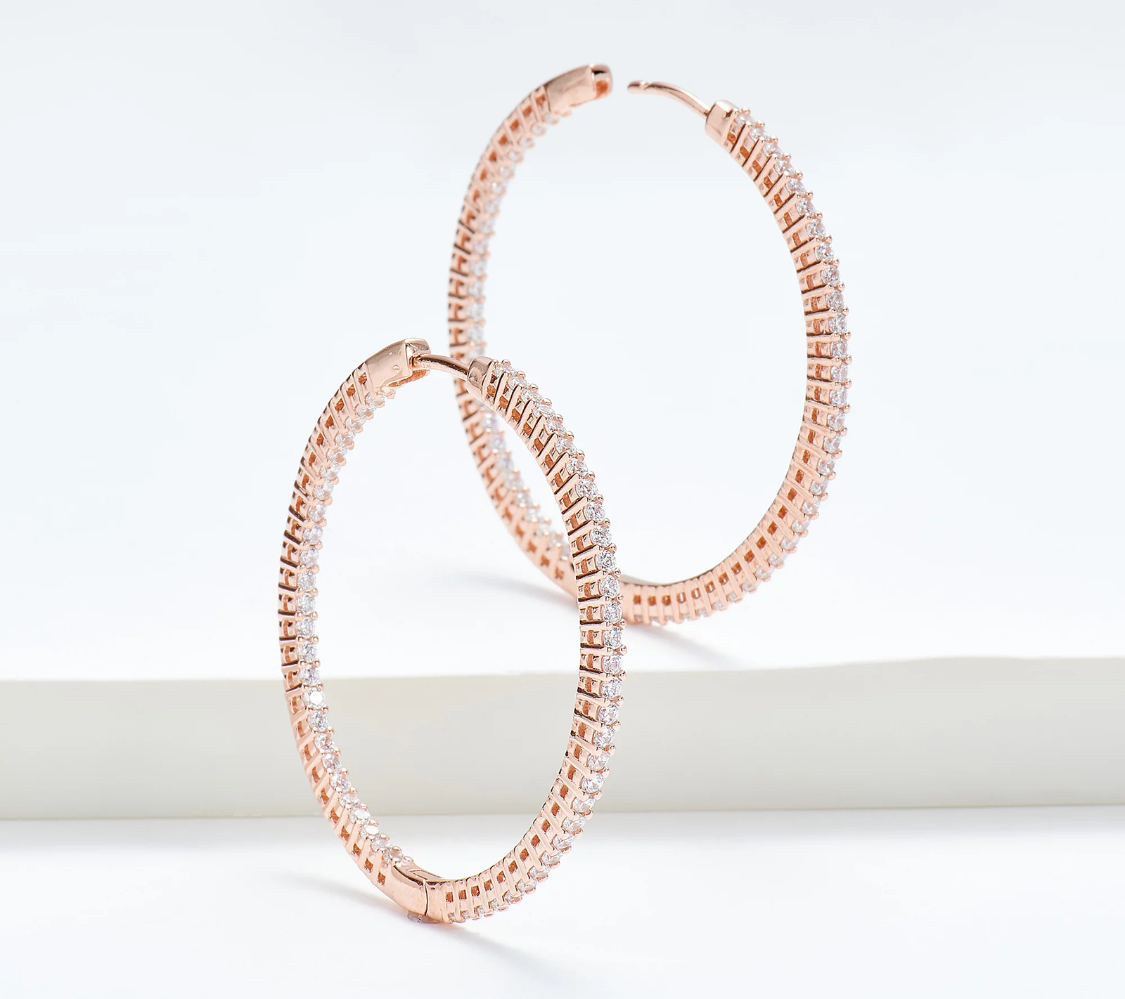 Elevate your everyday elegance with these stunning 1-1/2" inside-out hoop earrings from Diamonique®. Crafted in a warm, romantic rose tone, these hoops shimmer with rows of brilliant round-cut simulated diamonds. The inside-out design ensures maximum sparkle from every angle — both inside the hoop and out — creating a dazzling frame around the face.