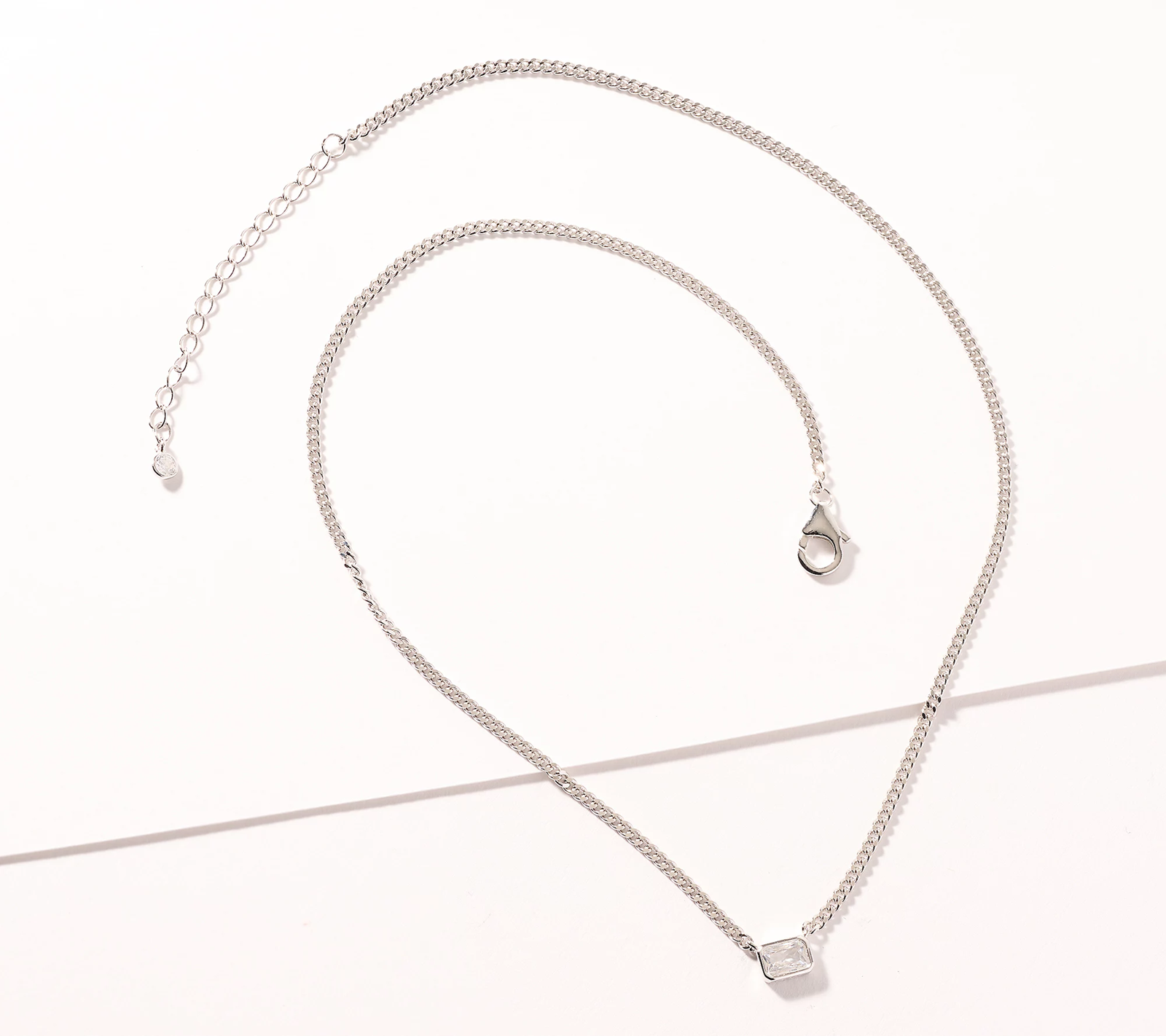 For something a little more substantial than a simple solitaire necklace, we have just the piece for you. Beautifully balanced on a curb link chain, the focal point of this necklace is a bold and brilliant emerald-cut stone worthy of finishing off your latest fashion statement