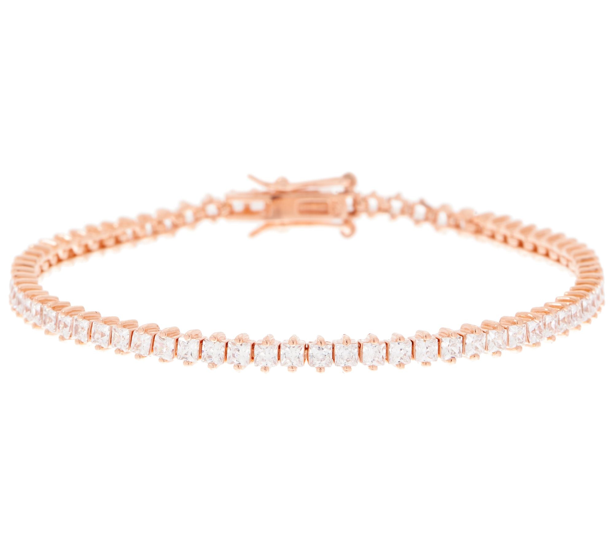 Elevate your jewelry collection with the Diamonique Sterling Silver Roseclad Princess-Cut Tennis Bracelet—a stunning piece that combines timeless elegance with a modern, romantic touch. Crafted in roseclad sterling silver, this bracelet offers the luxurious appearance of rose gold, complementing a wide range of styles.