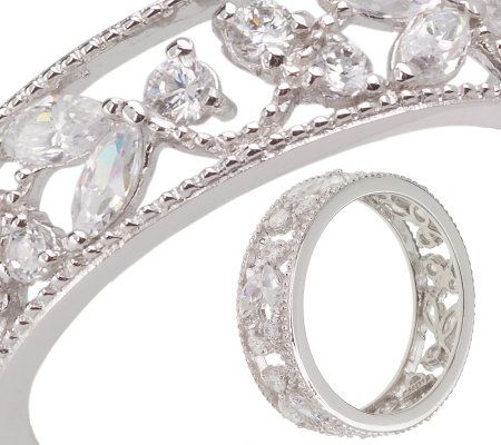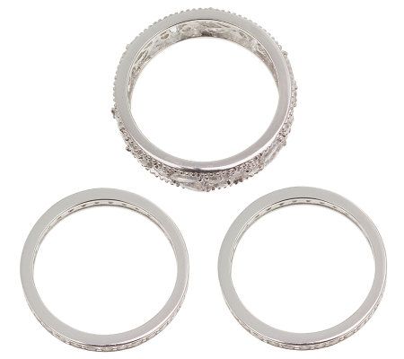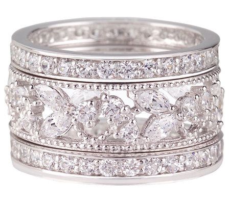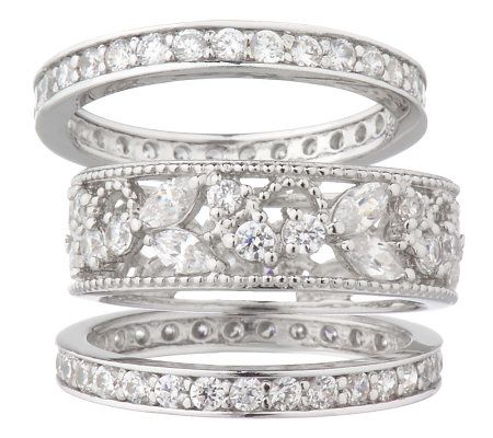 Radiate sheer sophistication with this ring set. Round and marquise-shaped Diamonique(R) simulated diamonds adorn one of the rings to create the beautiful look of lace. Two eternity bands--shimmering with round, bead-set Diamonique stones--complete the eye-catching silhouette. Wear one, two, or all three for a dramatic display of fiery brilliance. From Epiphany(R) Platinum Clad(R) Sterling Silver and Diamonique Jewelry.