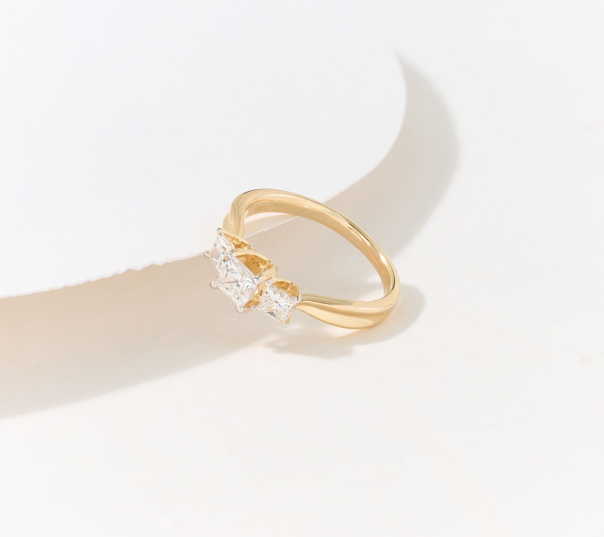 The Fire Light 14K Yellow Gold Lab-Grown Diamond Princess 1cttw Ring is an elegant piece featuring three sizable lab-grown diamonds set in a polished 14K yellow gold band.