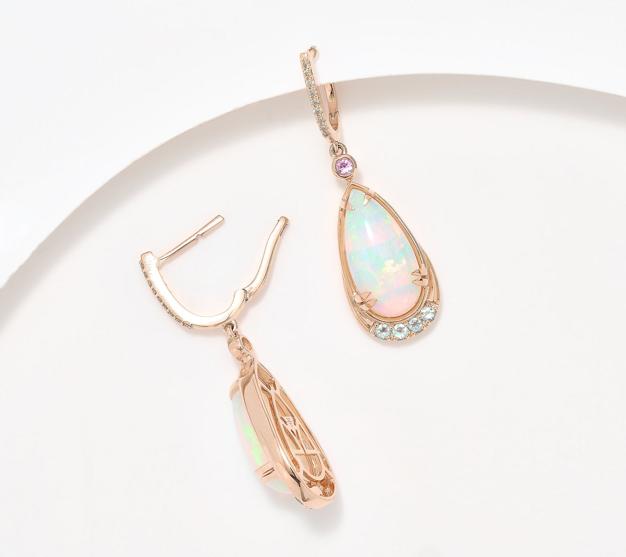 Your big moment has arrived. Accessorize in these Ethiopian opal earrings - a drop design highlighted by pink sapphire, aquaiba, and light brown diamonds -- and embrace a beauty that you (and they) will never forget. From Gem Discoverer.